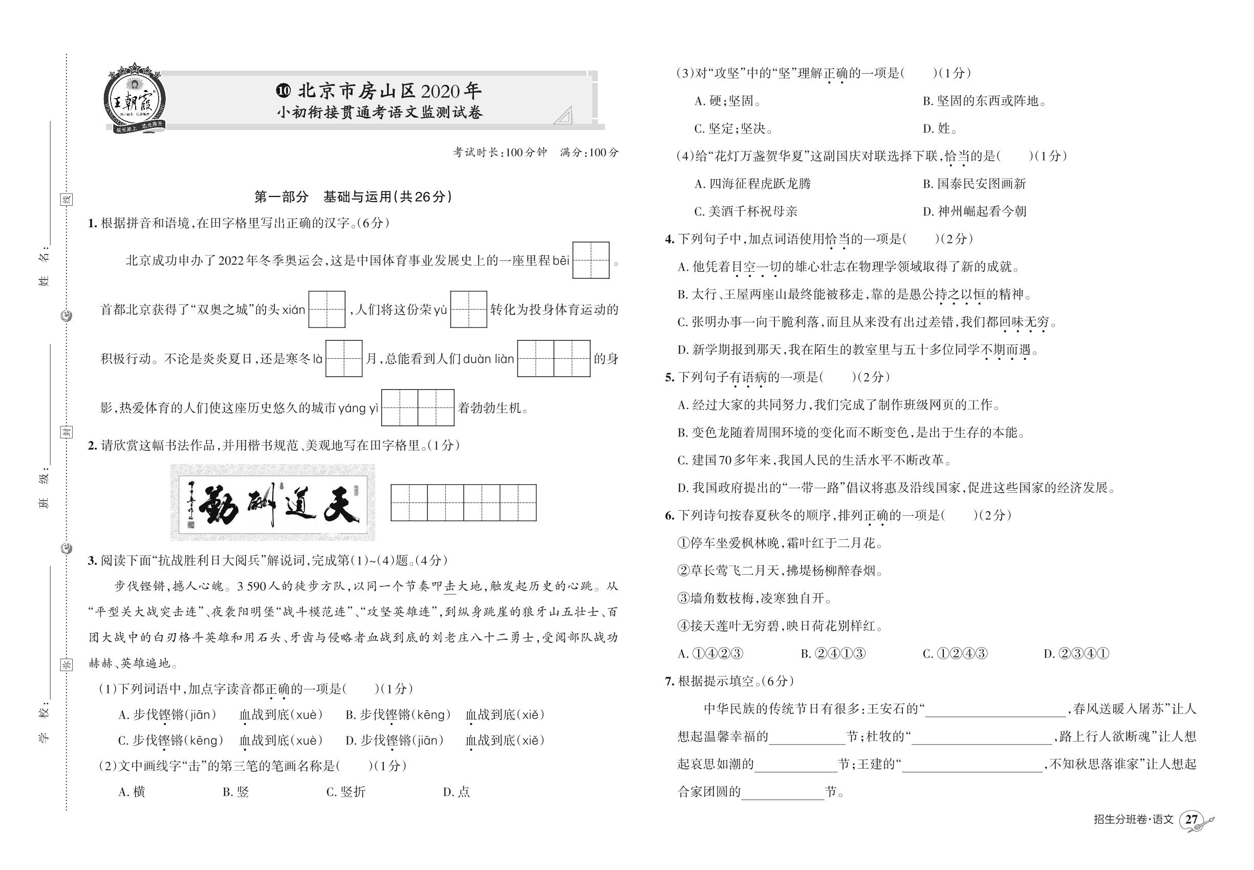 小升初语文北京市房山区2020年小初衔接贯通考语文监测试卷【10】