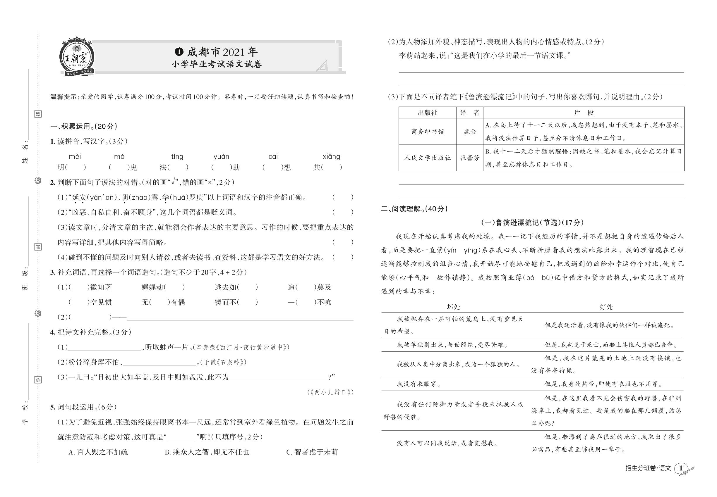 小升初语文成都市2021年小学毕业考试语文试卷【1】