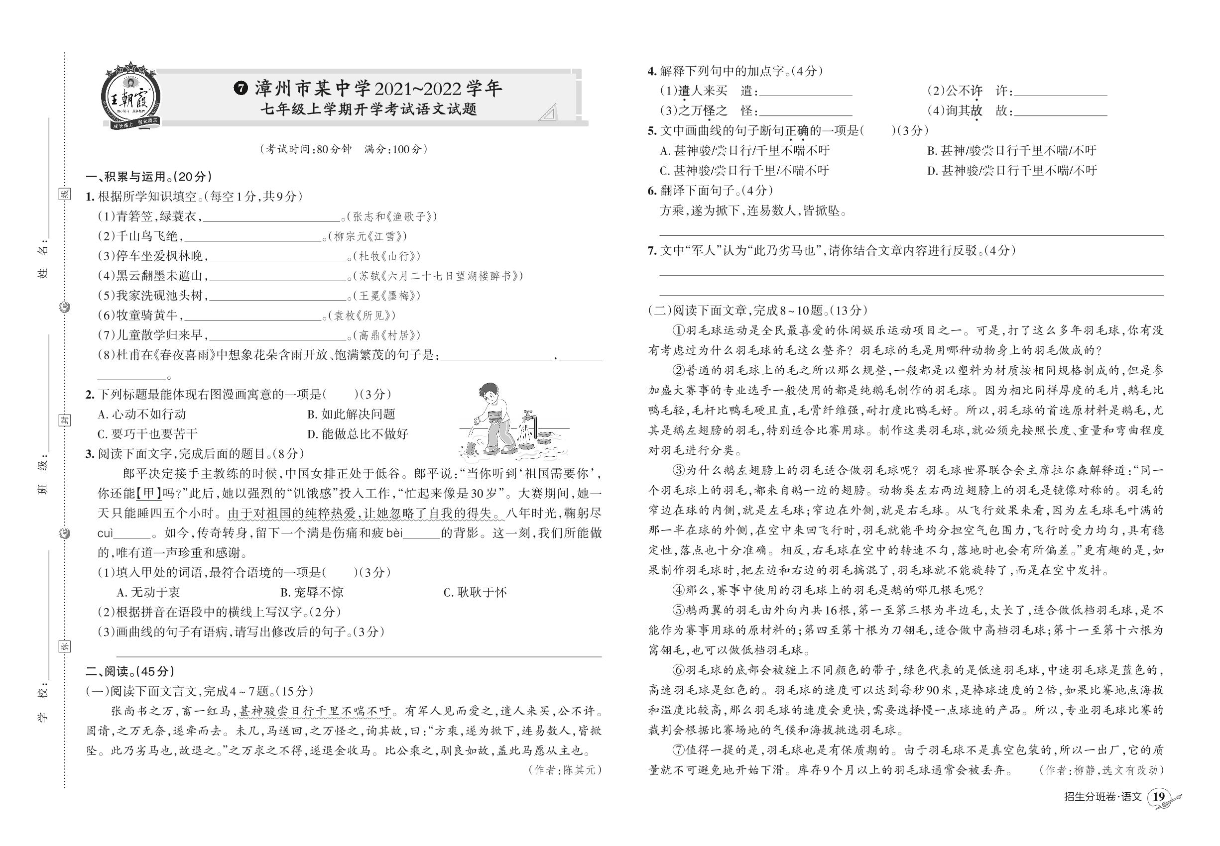 小升初语文漳州市某中学2021~2022学年七年级上学期开学考试语文试题【7】