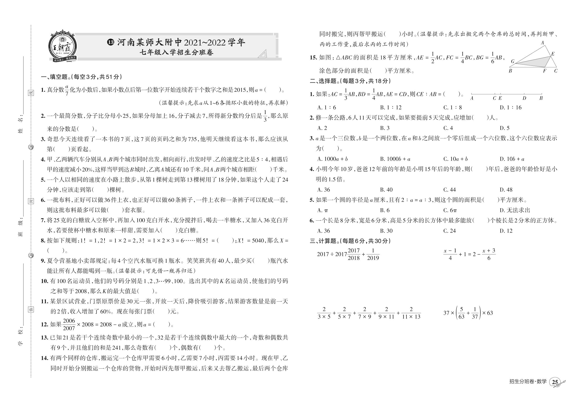 小升初数学河南某师大附中2021~2022学年七年级入学招生分班卷【13】