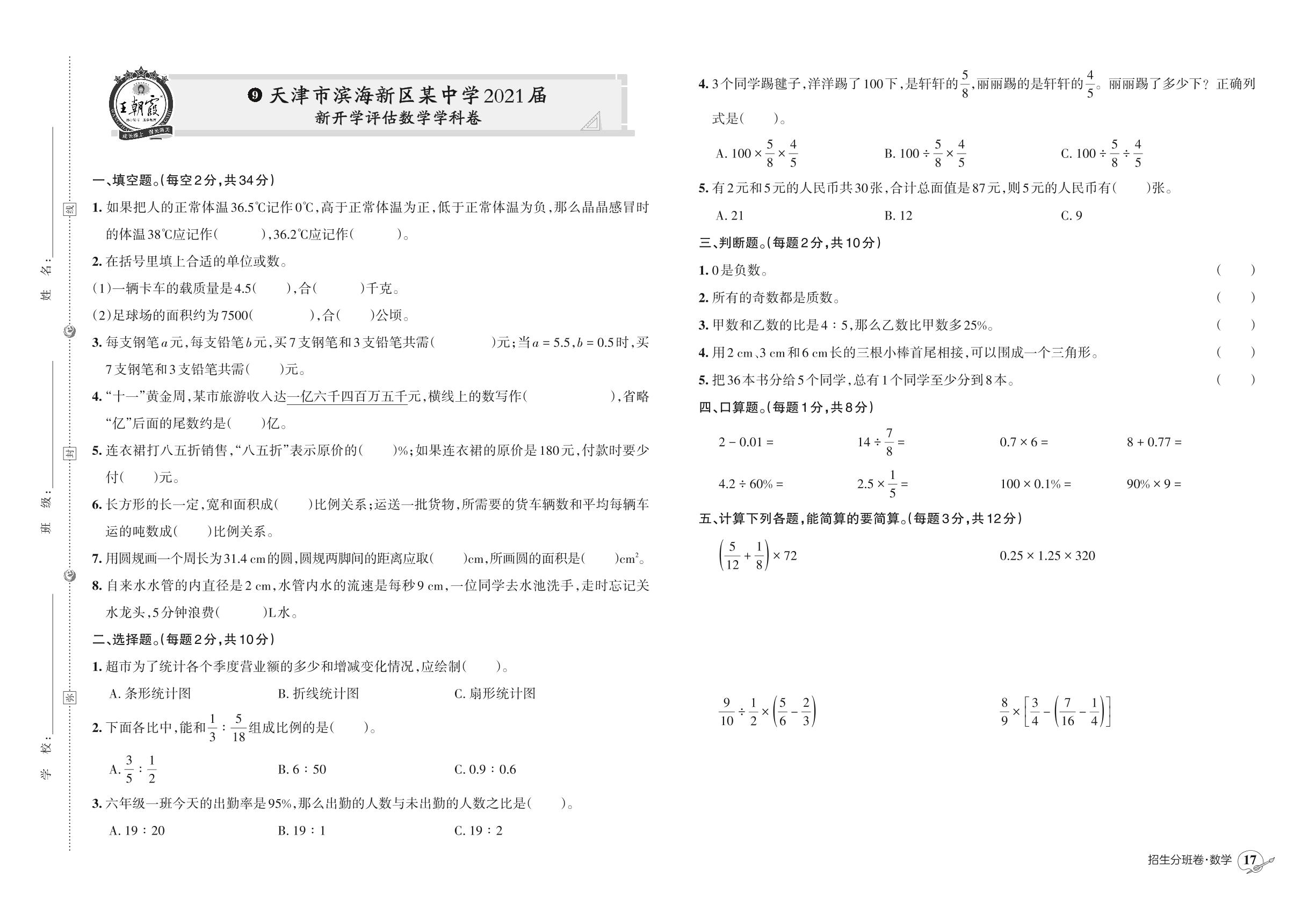小升初数学天津市滨海新区某中学2021届新开学评估数学学科卷【9】