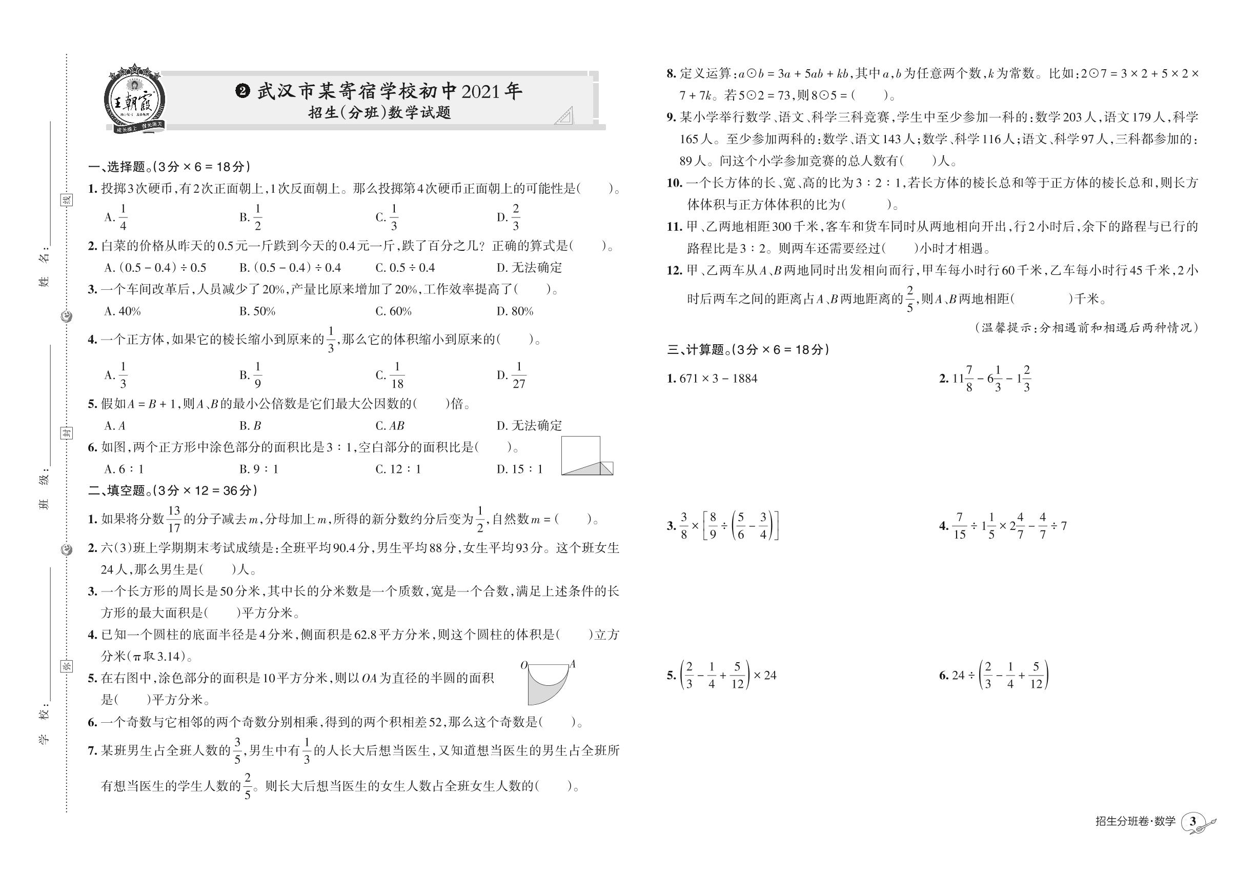 小升初数学武汉市某寄宿学校初中2021年招生(分班)数学试题【2】