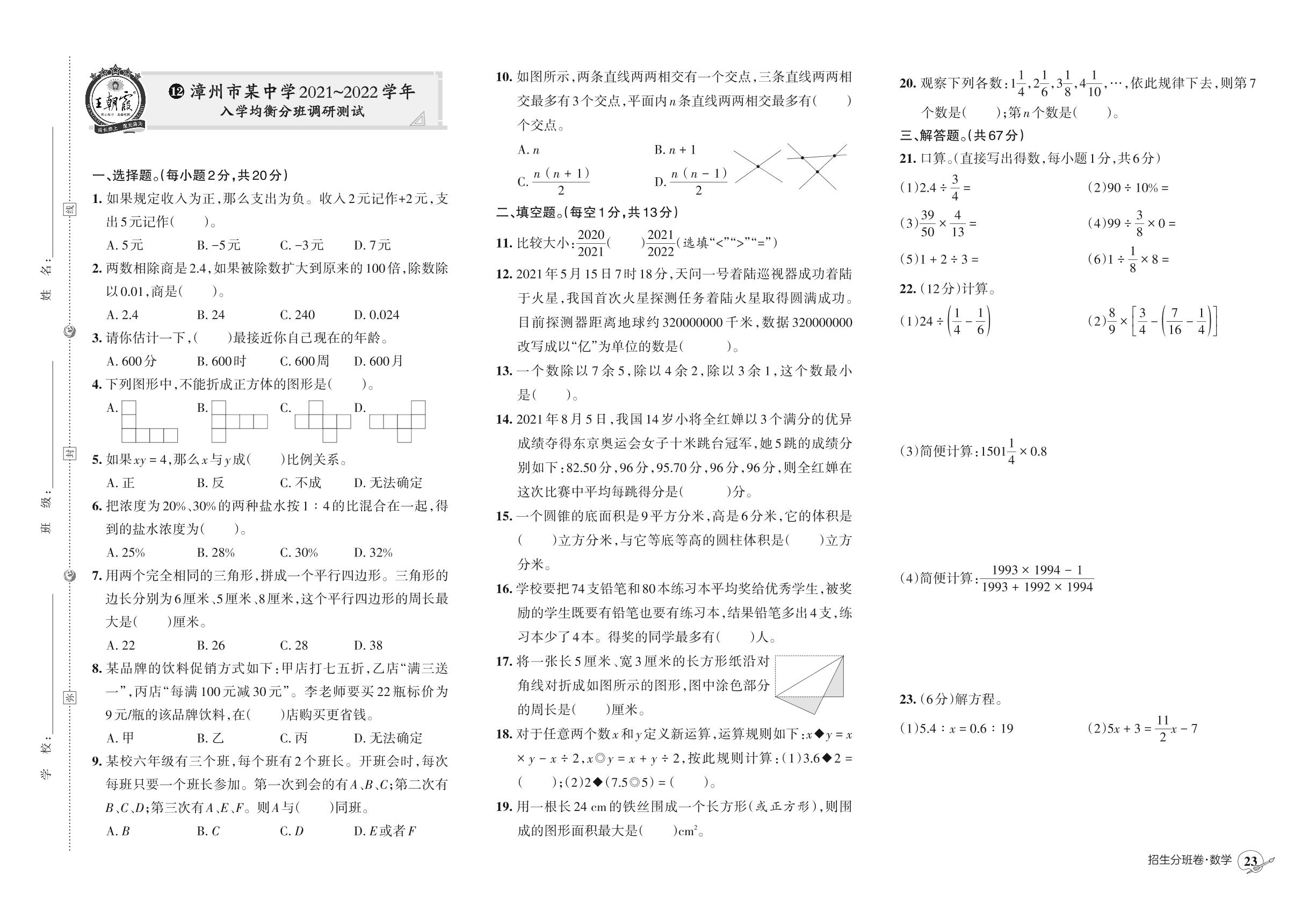 小升初数学漳州市某中学2021~2022学年入学均衡分班调研测试【12】