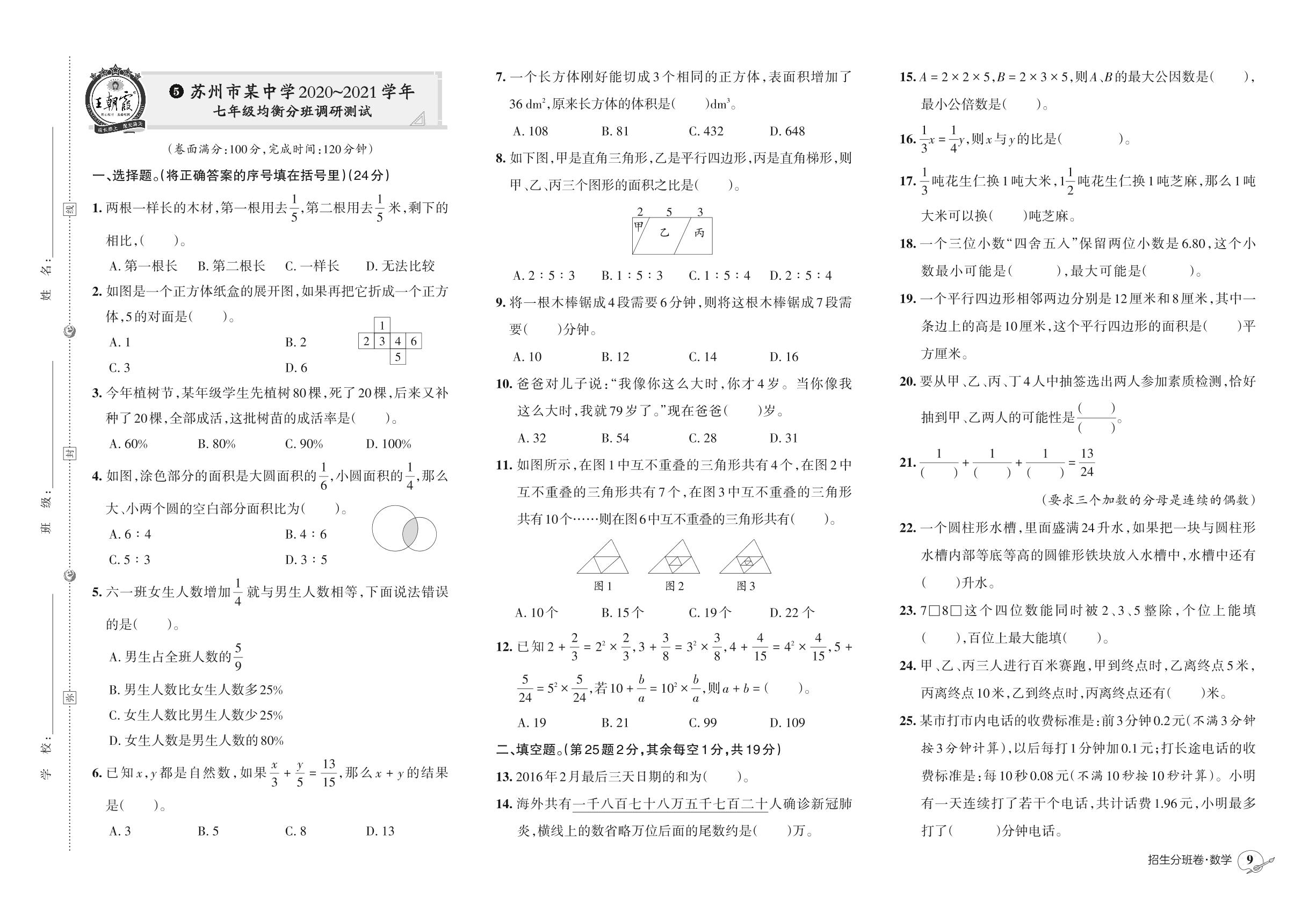 小升初数学苏州市某中学2020~2021学年七年级均衡分班调研测试【5】