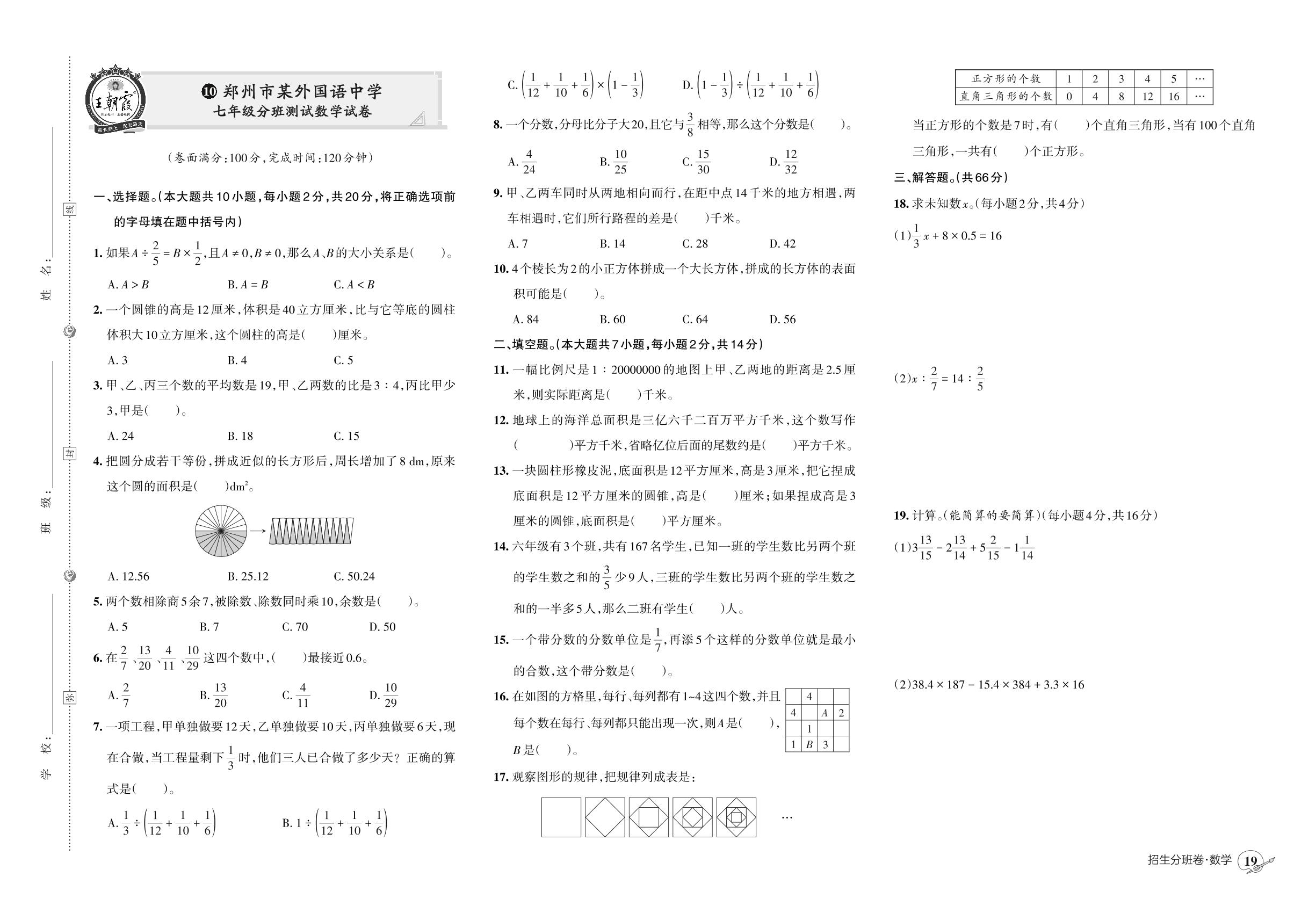 小升初数学郑州市某外国语中学七年级分班测试数学试卷【10】