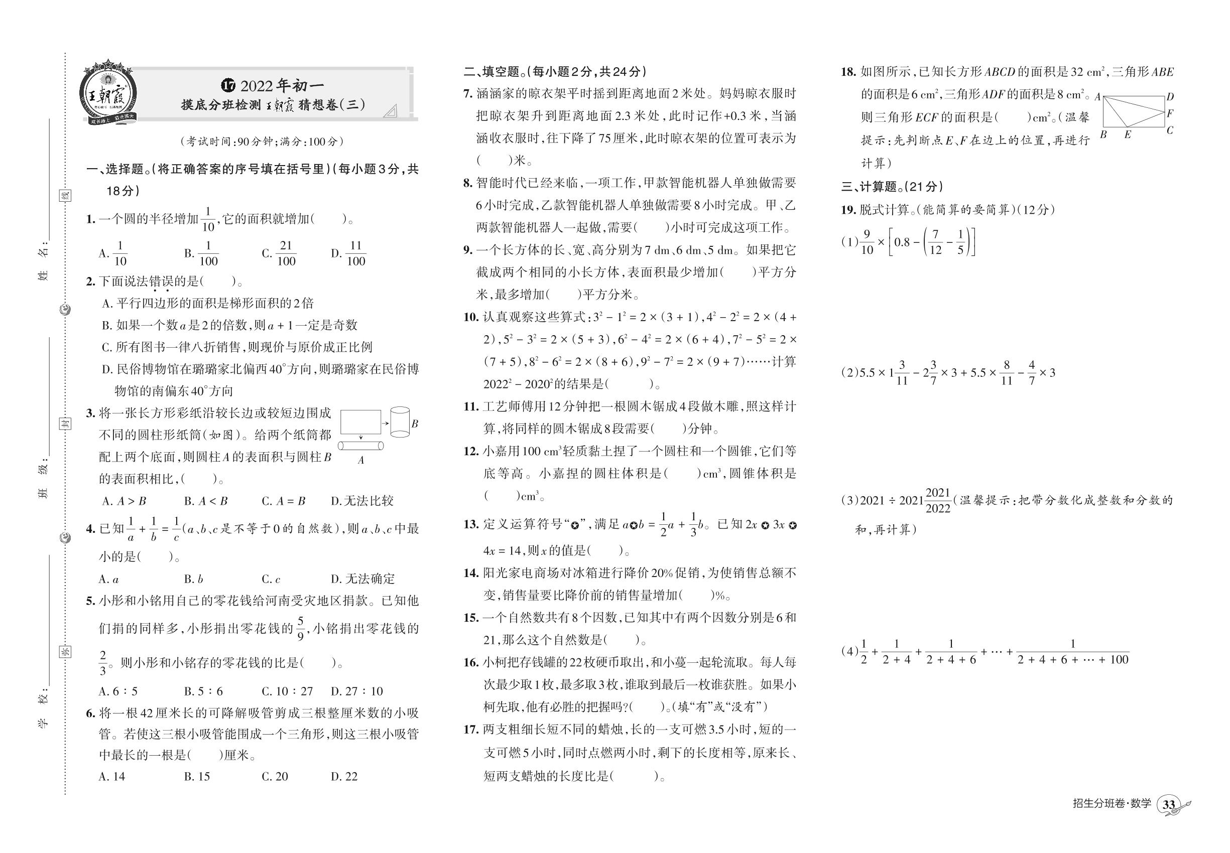 小升初数学初一摸底分班检测王朝霞猜想卷(三)【17】