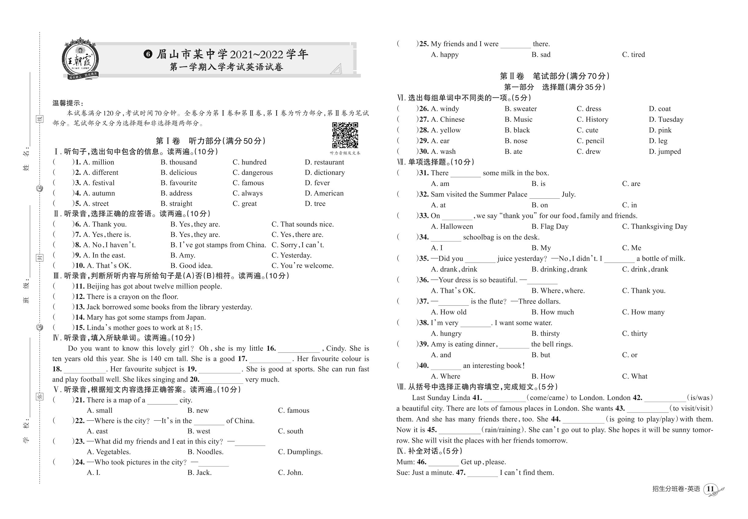 小升初英语眉山市某中学2021~2022学年第一学期入学考试英语试卷【6】