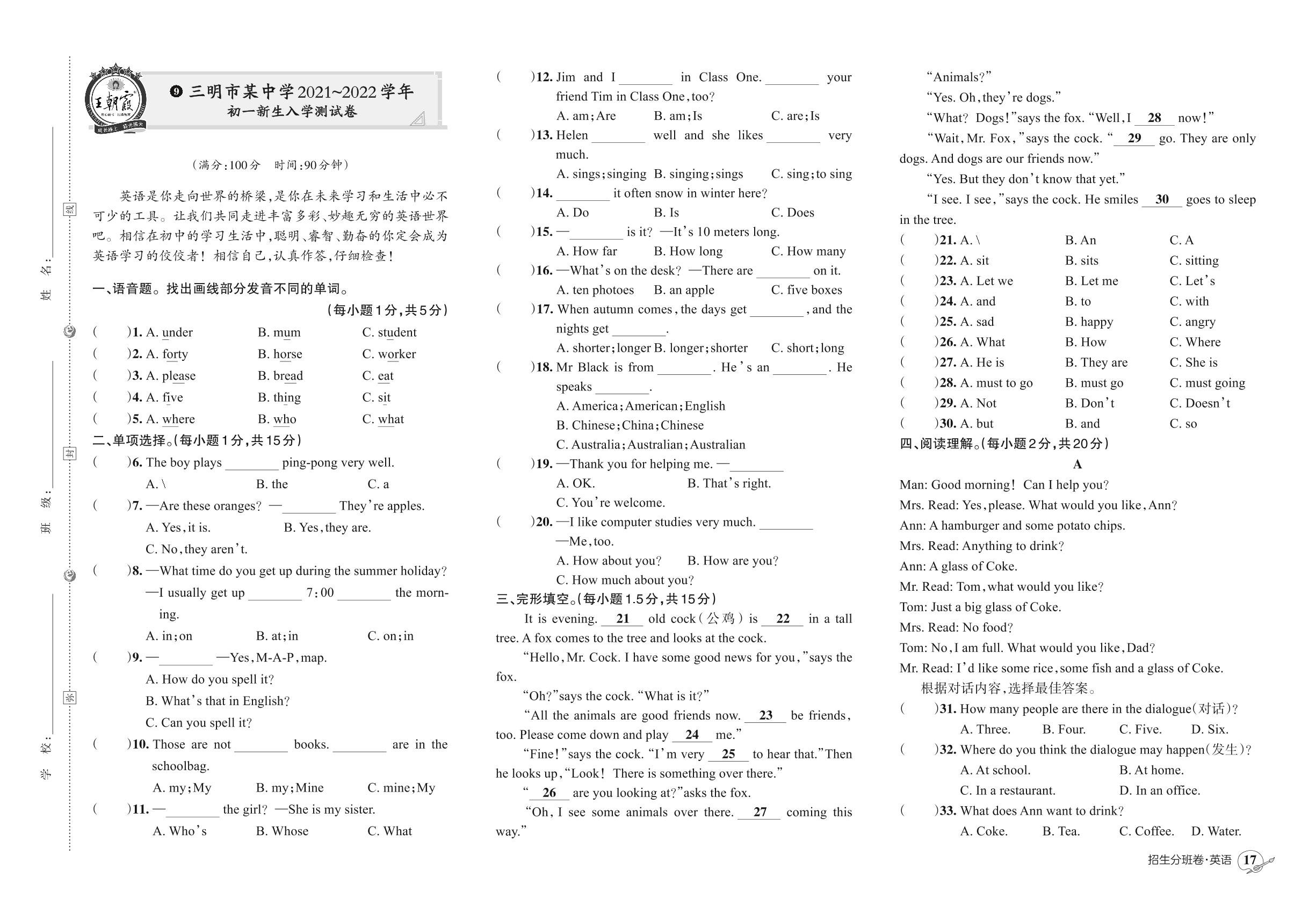 小升初英语三明市某中学2021~2022学年初一新生入学测试卷【9】