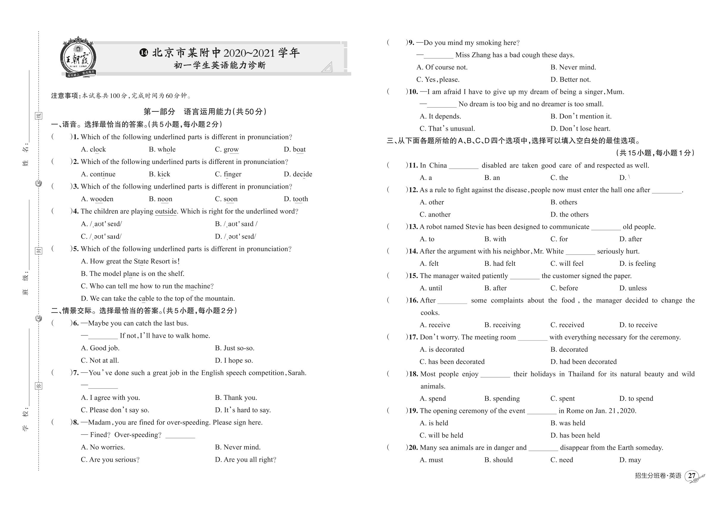 小升初英语北京市某附中2020~2021学年初一学生英语能力诊断【14】