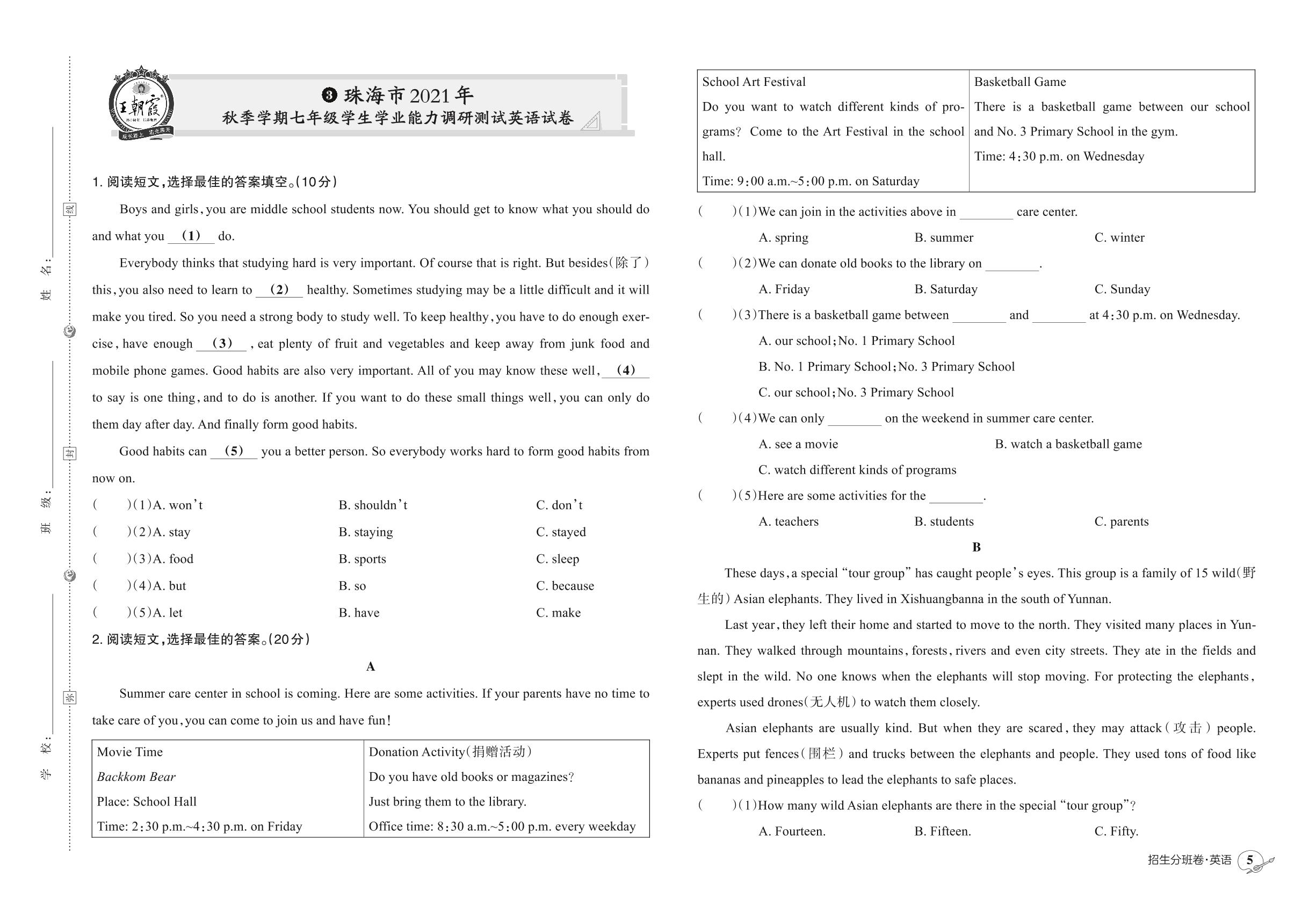 小升初英语珠海市2021年秋季学期七年级学生学业能力调研测试英语试卷【3】
