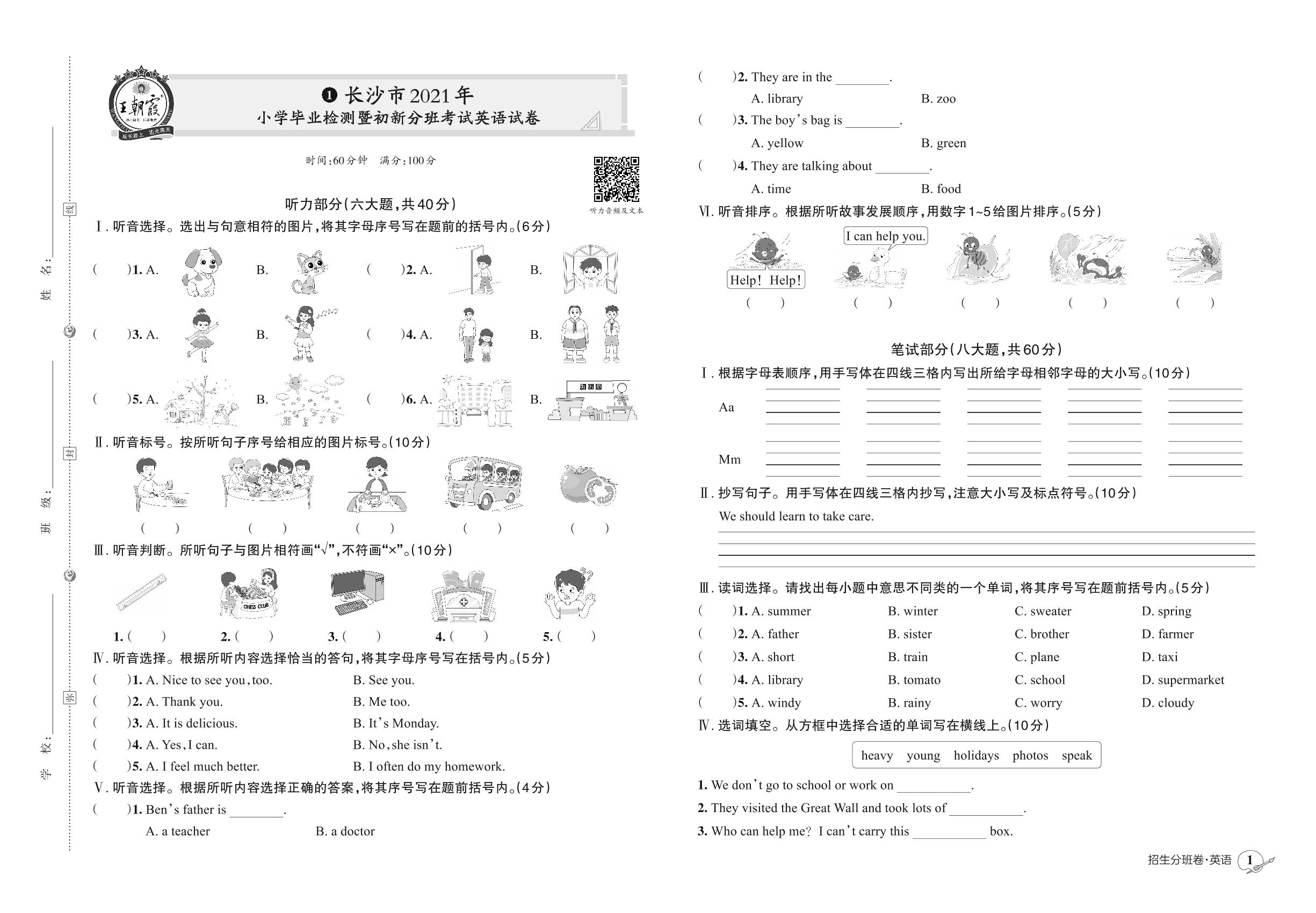 小升初英语长沙市2021年小学毕业检测暨初新分班考试英语试卷【1】