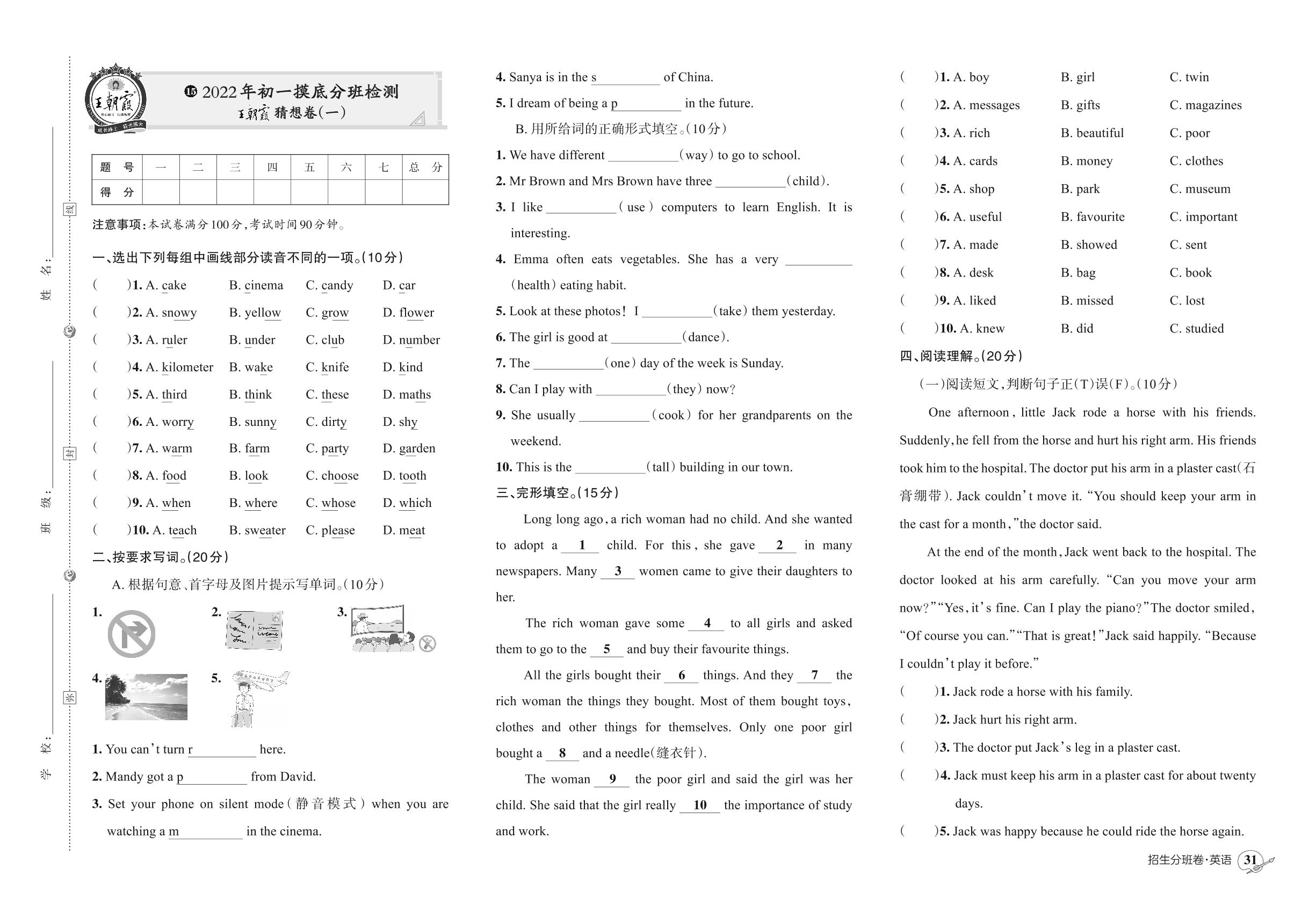 小升初英语初一摸底分班检测王朝霞猜想卷(一)【15】