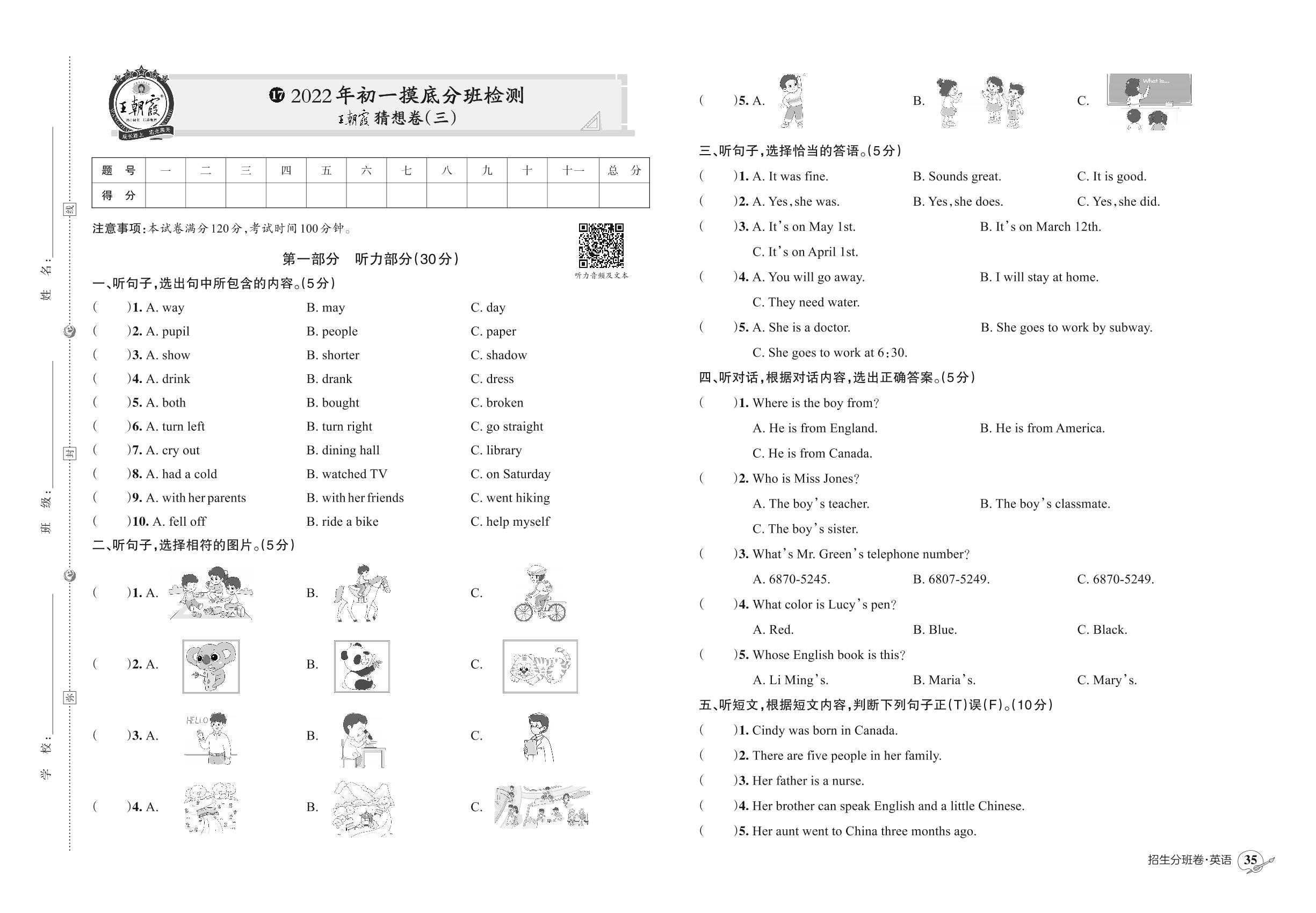 小升初英语初一摸底分班检测王朝霞猜想卷(三)【17】