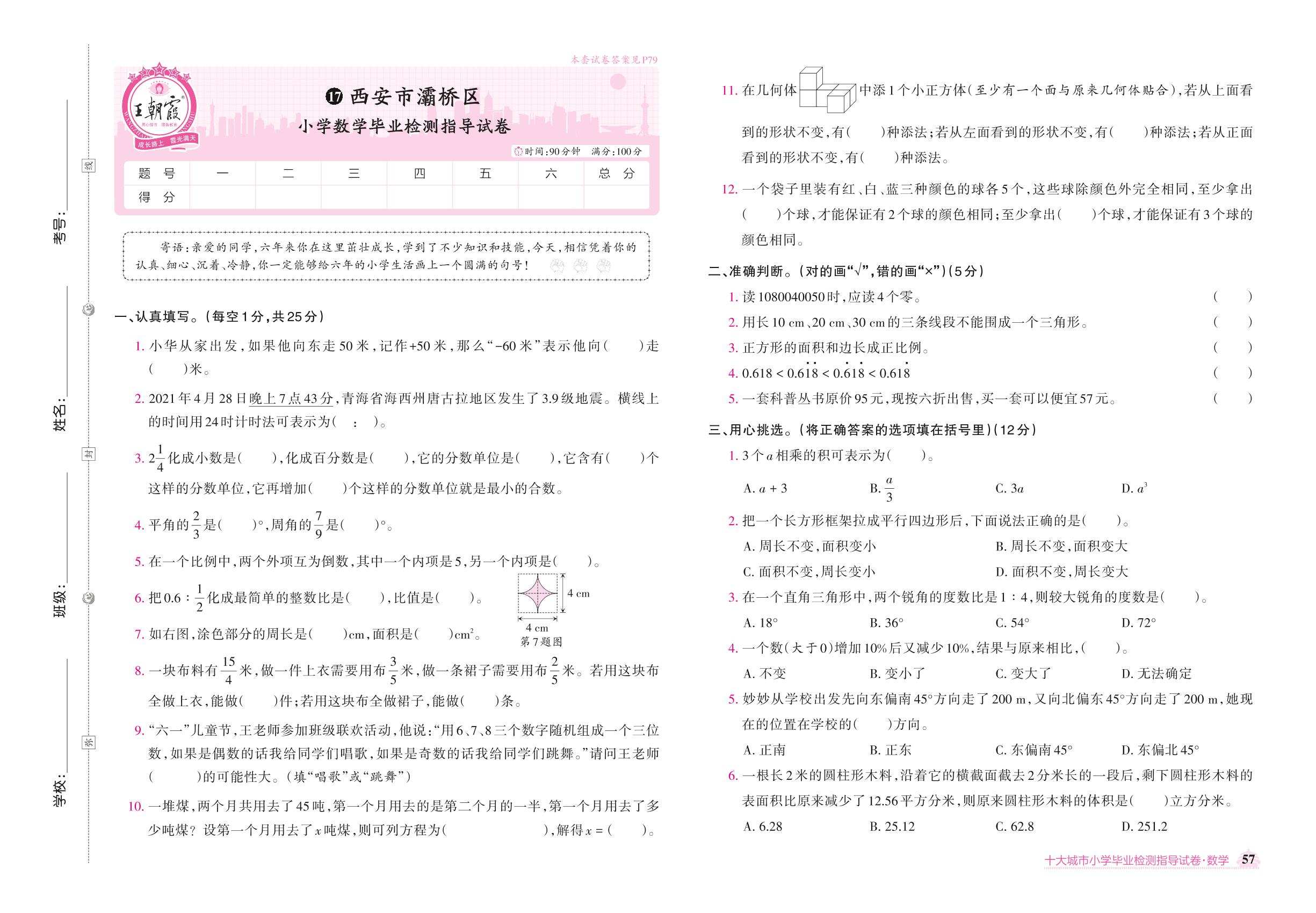 西安市灞桥区小学数学毕业检测指导试卷【17】