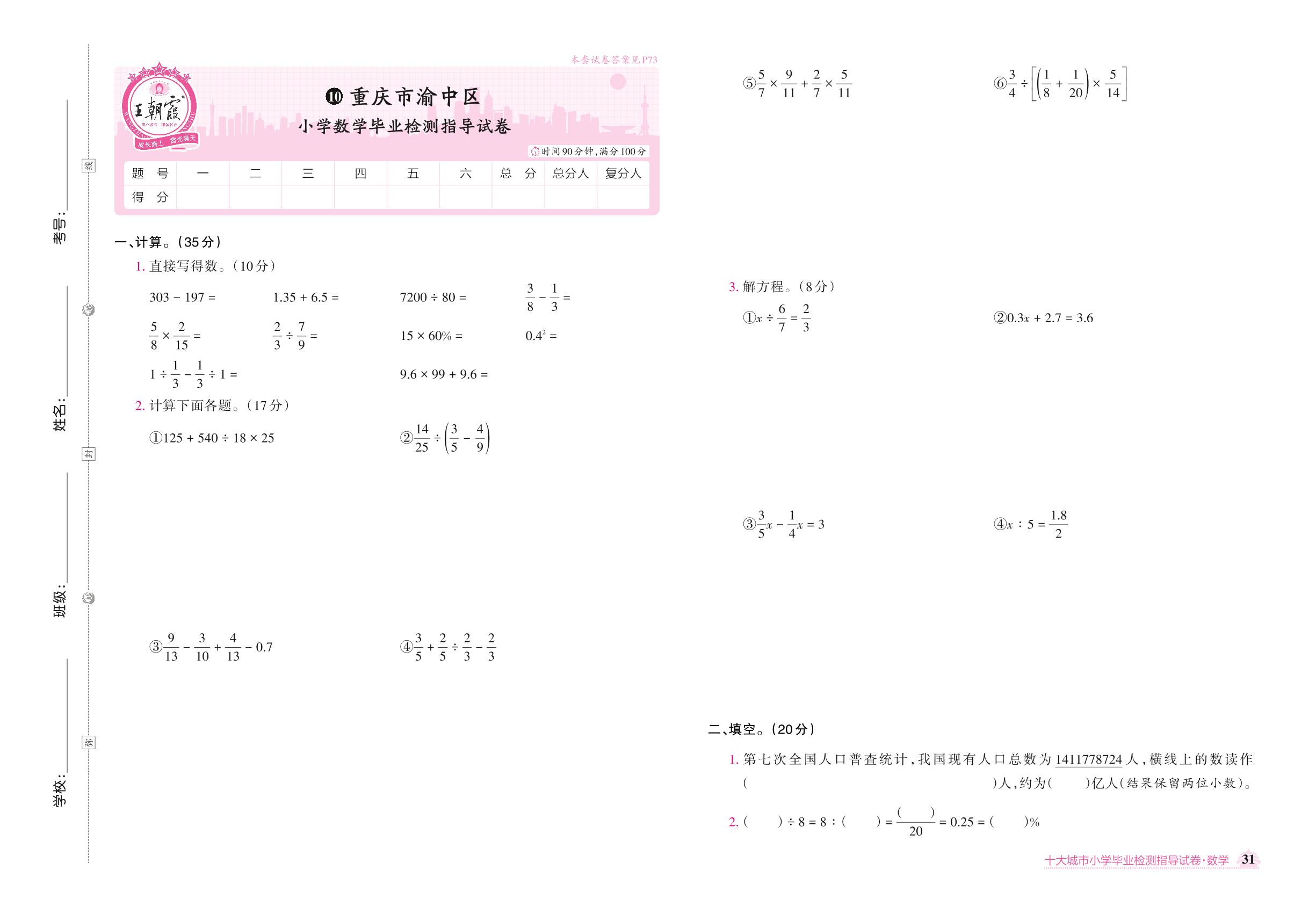 重庆市渝中区小学数学毕业检测指导试卷【10】