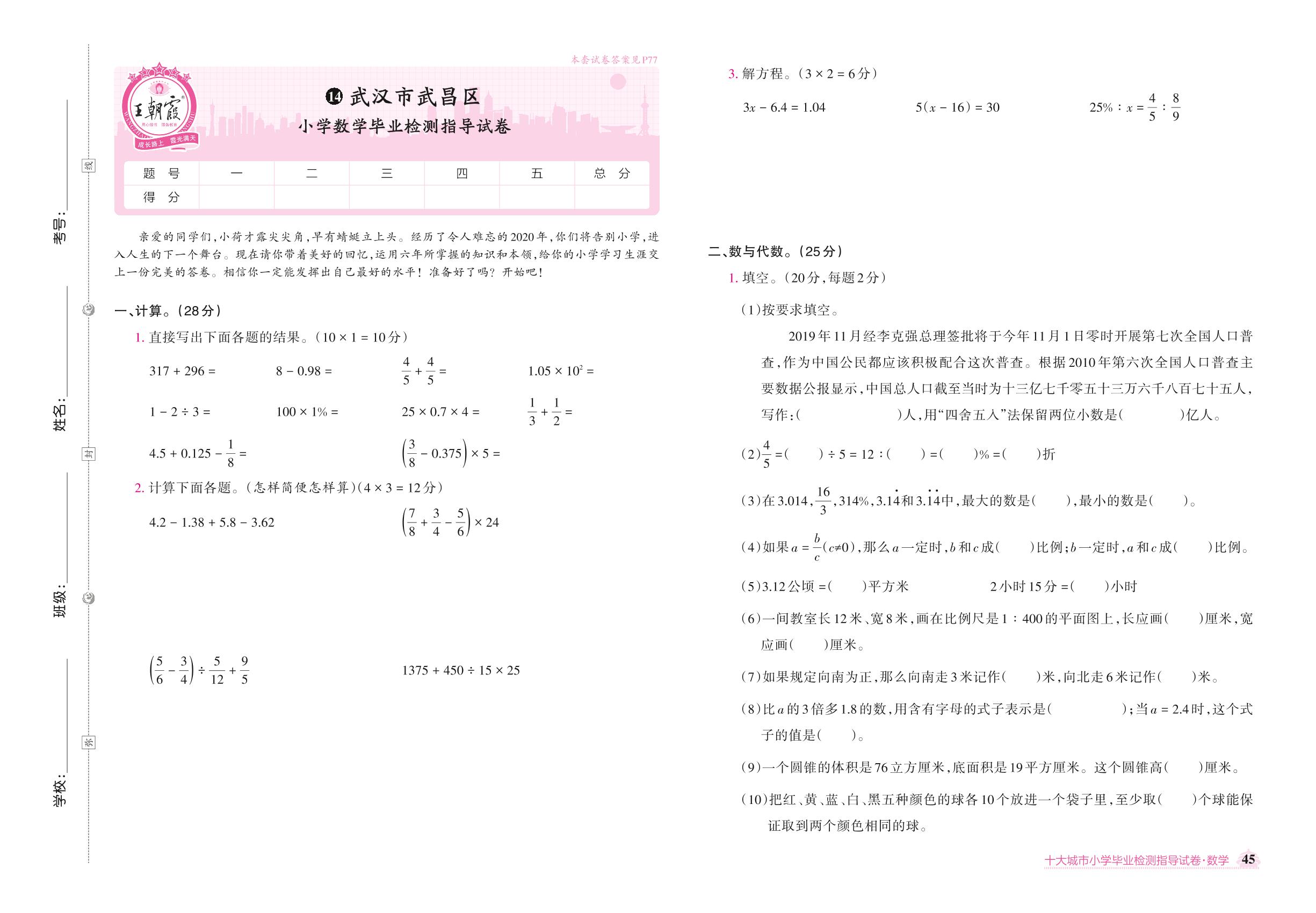 武汉市武昌区小学数学毕业检测指导试卷【14】