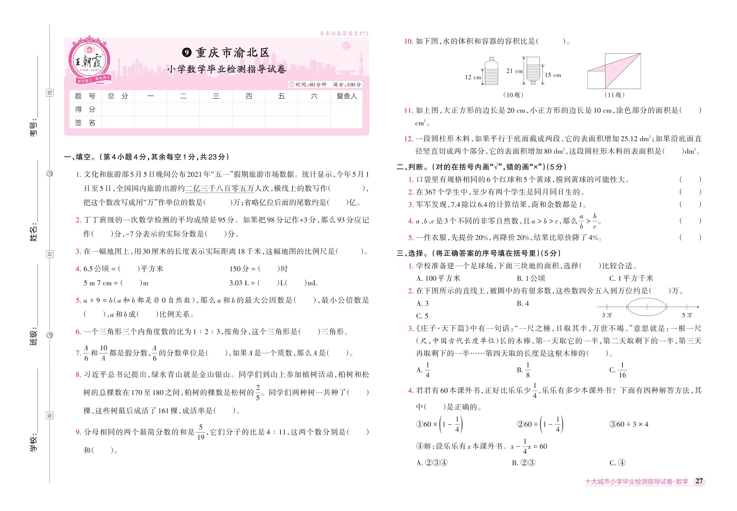 重庆市渝北区小学数学毕业检测指导试卷【9】