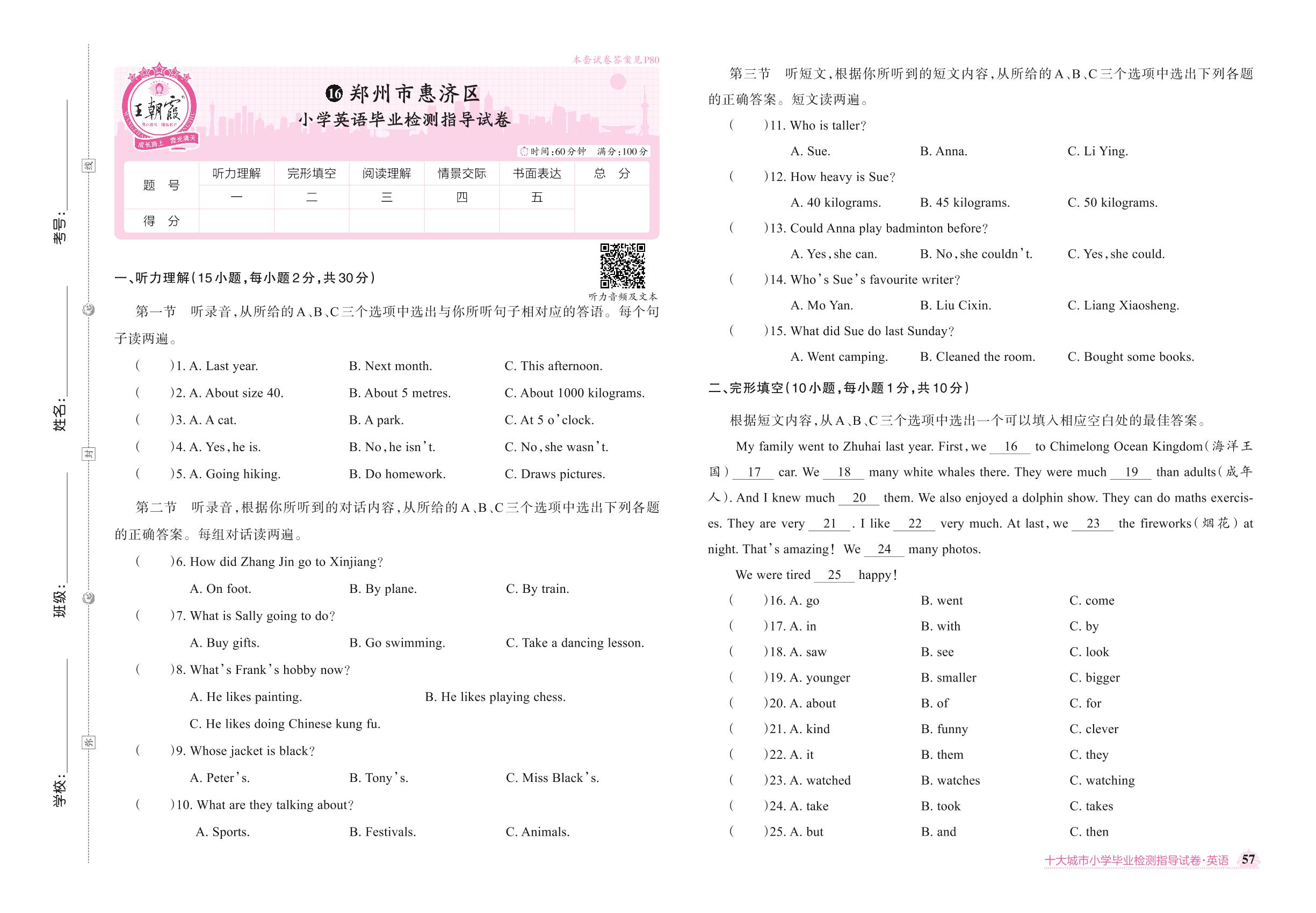 郑州市惠济区小学英语毕业检测指导试卷【16】