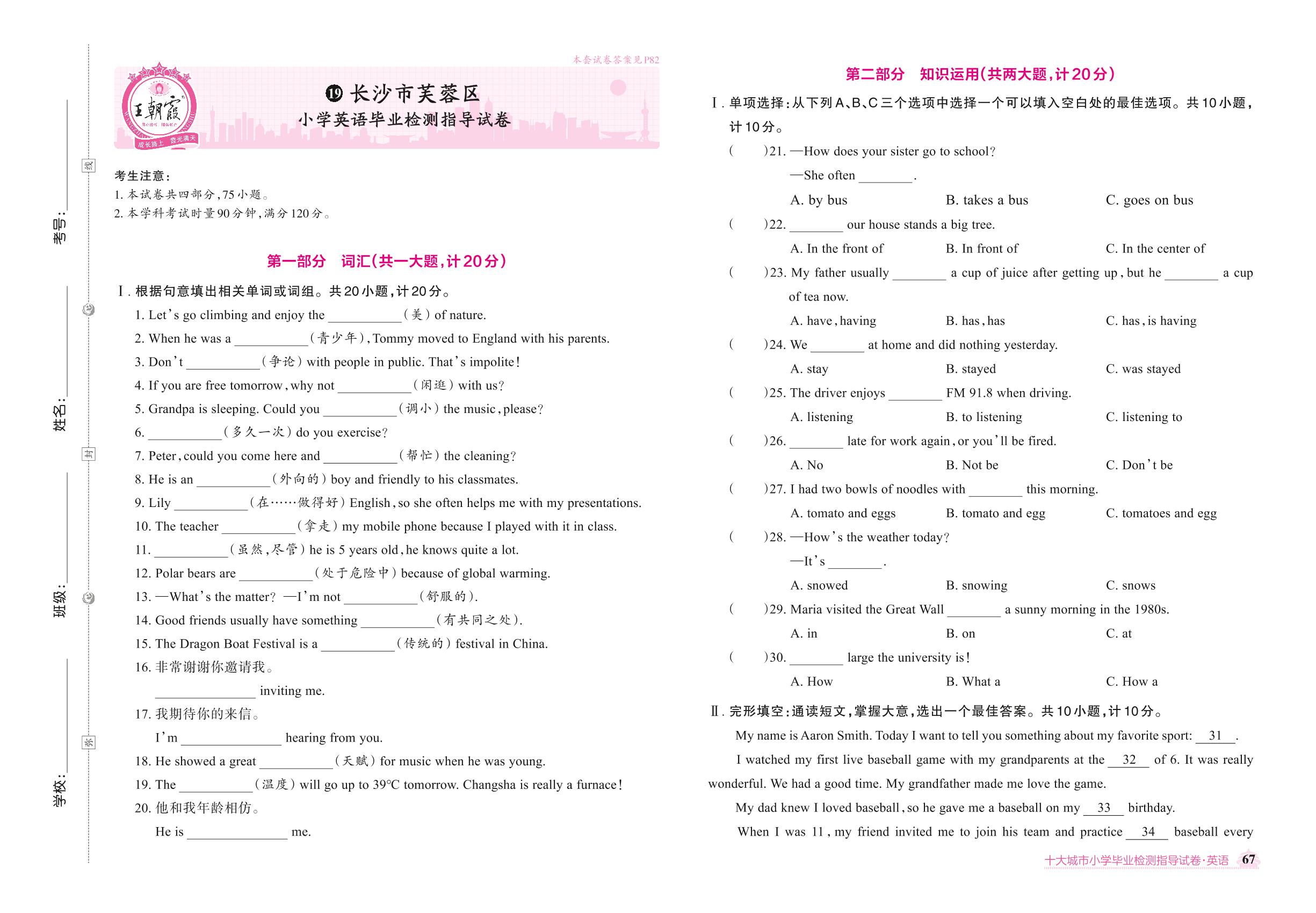 长沙市芙蓉区小学英语毕业检测指导试卷【19】