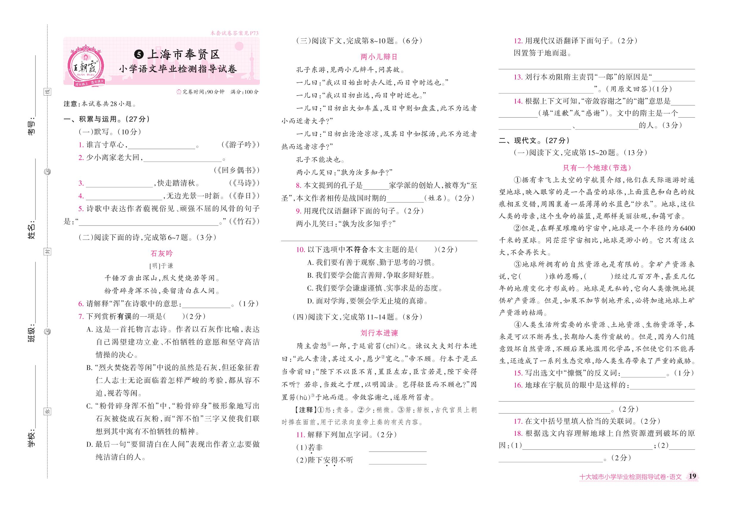 上海市奉贤区小学语文毕业检测指导试卷【5】