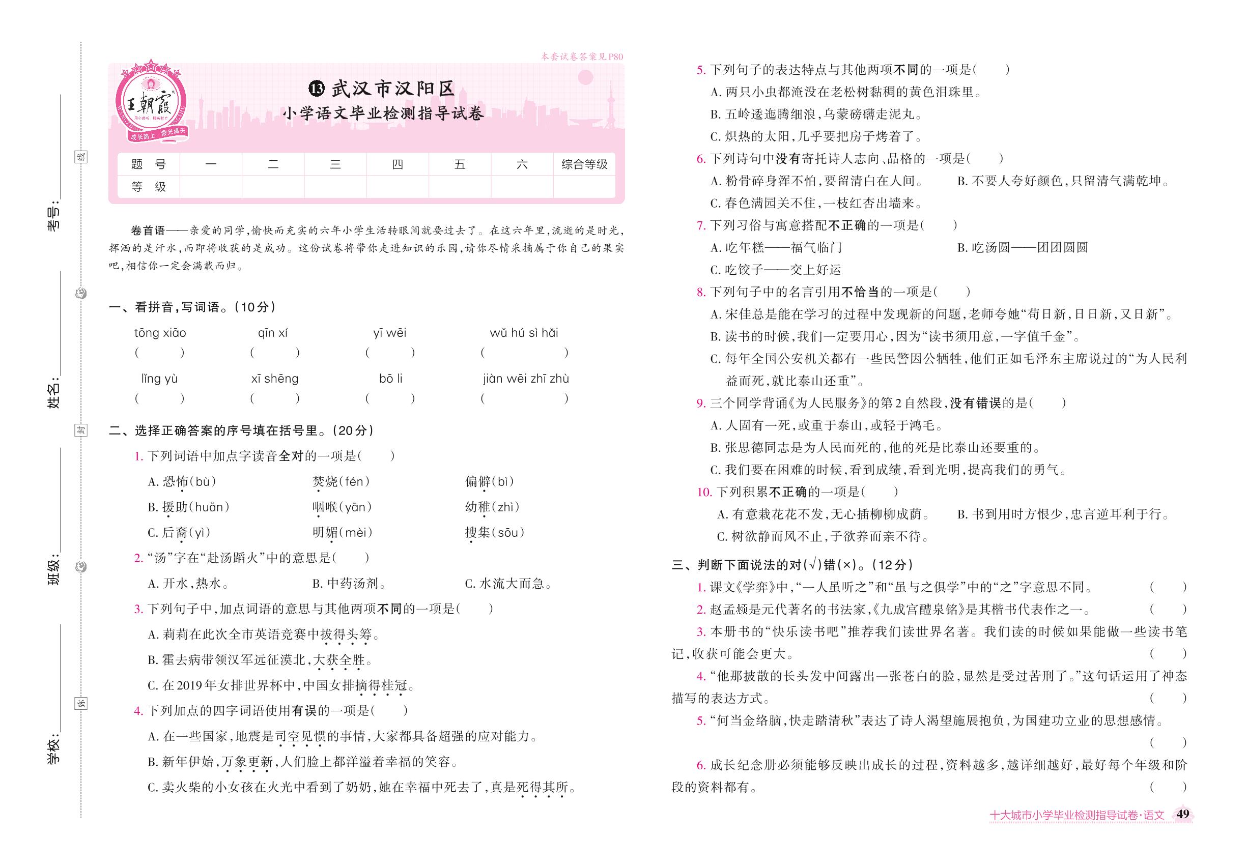 武汉市汉阳区小学语文毕业检测指导试卷【13】