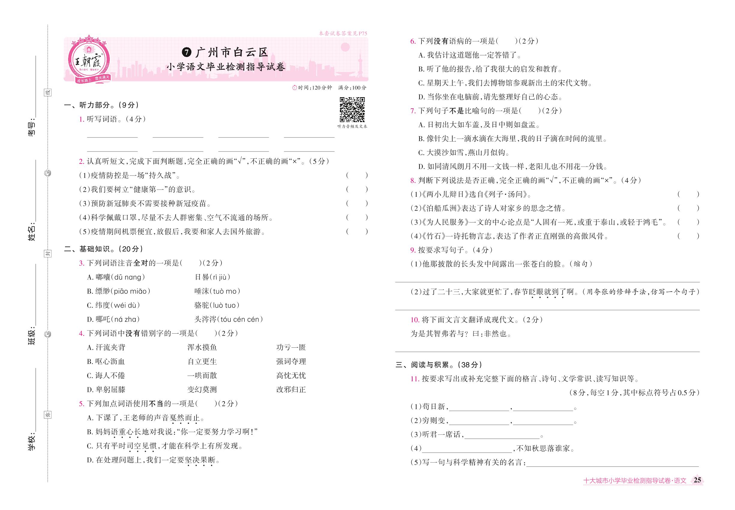 广州市白云区小学语文毕业检测指导试卷【7】