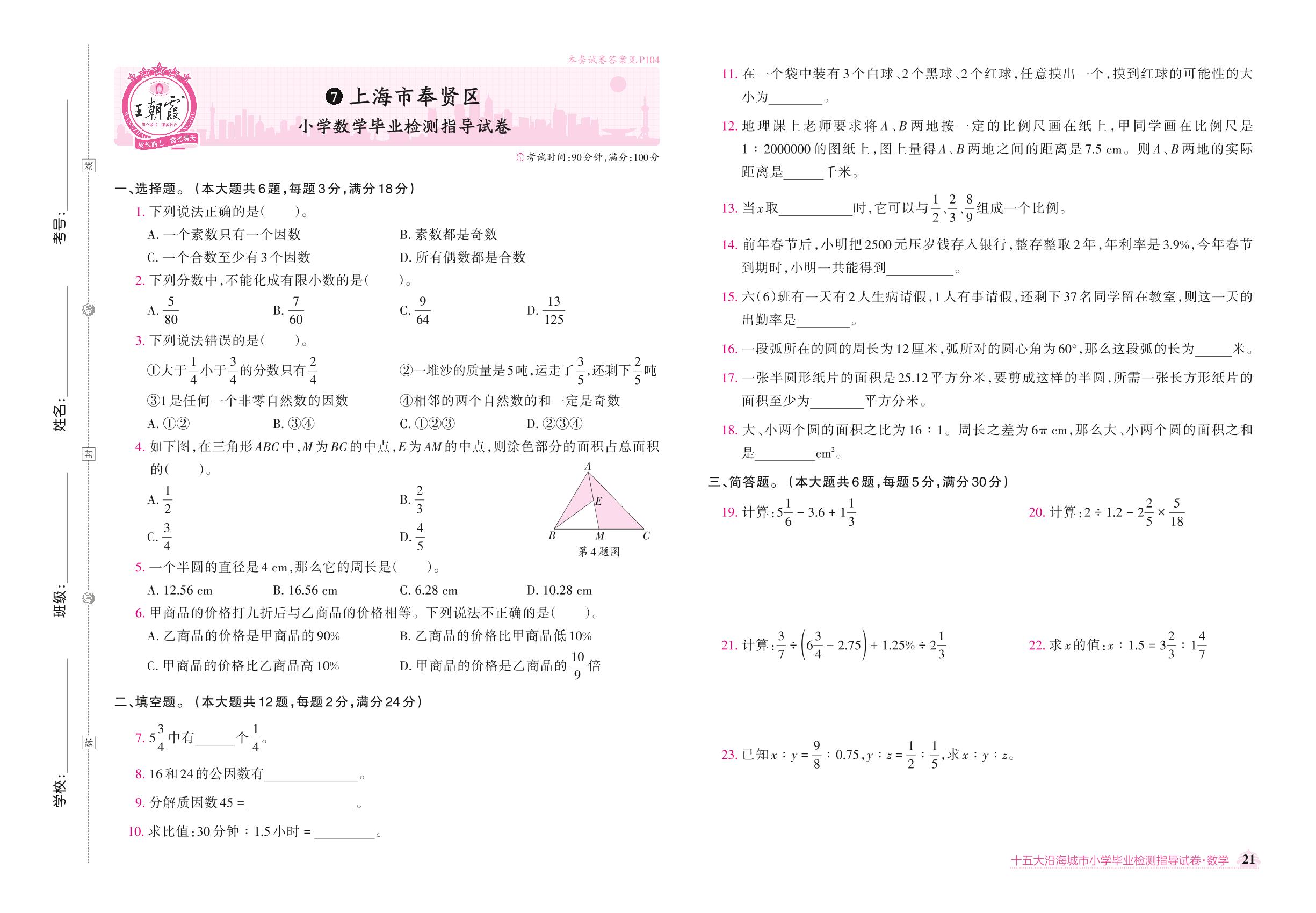 上海市奉贤区小学数学毕业检测指导试卷【7】