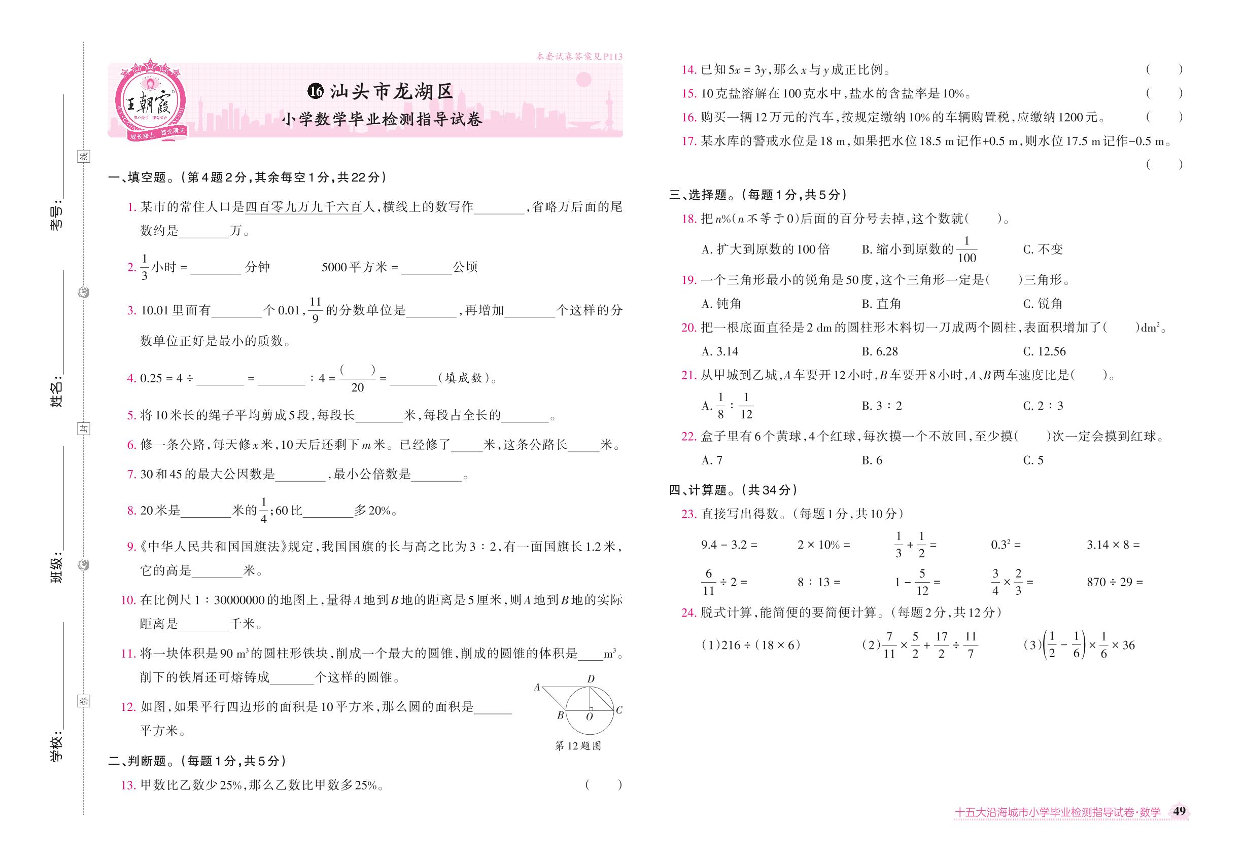 汕头市龙湖区小学数学毕业检测指导试卷【16】