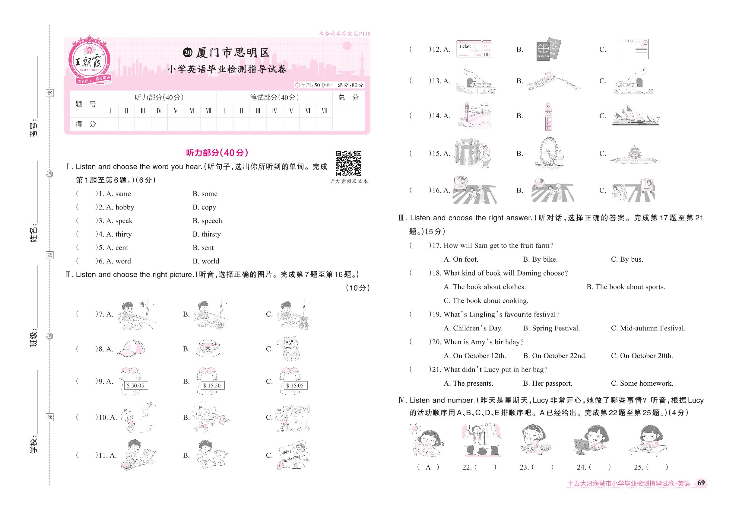 厦门市思明区小学英语毕业检测指导试卷【20】