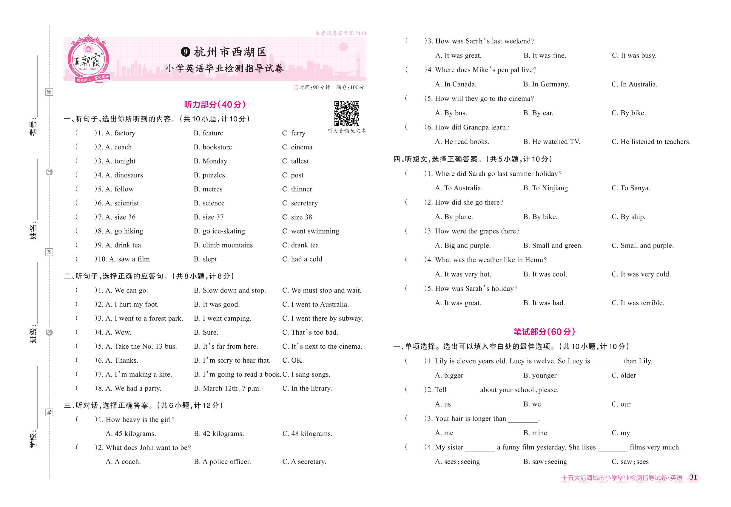 杭州市西湖区小学英语毕业检测指导试卷【9】