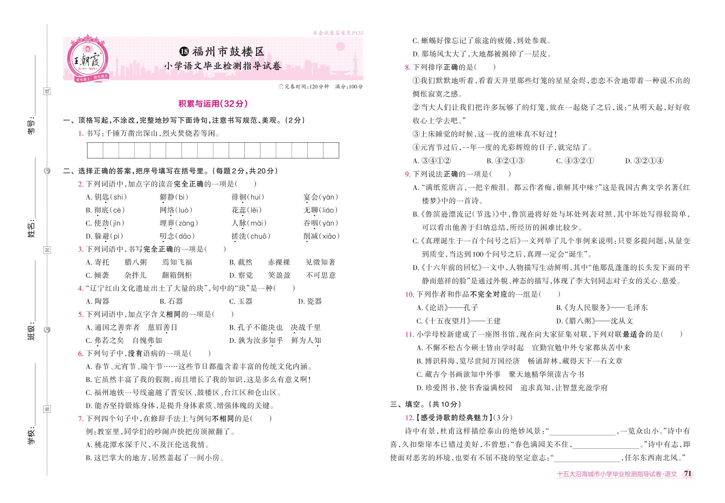 福州市鼓楼区小学语文毕业检测指导试卷【18】