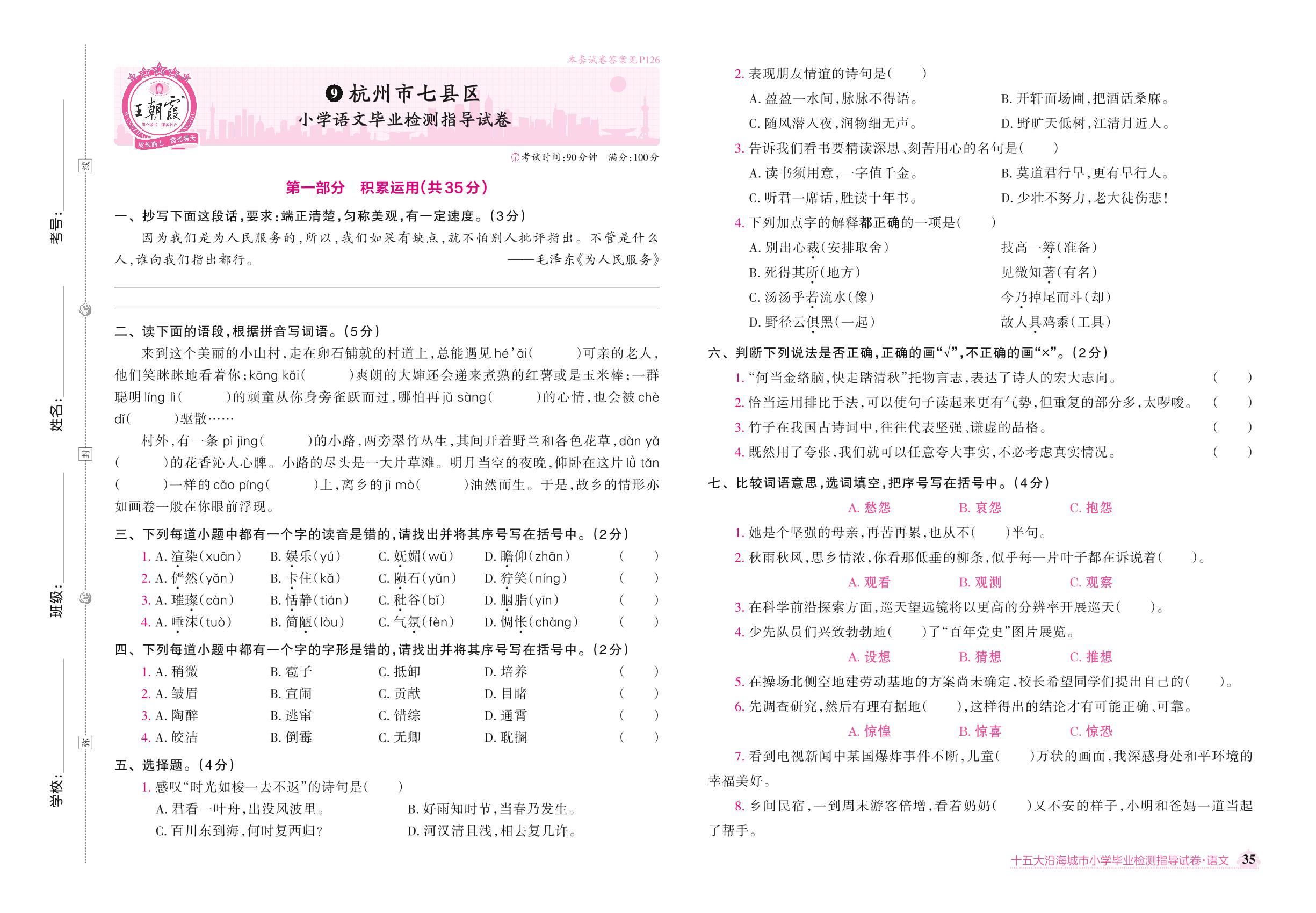 杭州市七县区小学语文毕业检测指导试卷【9】