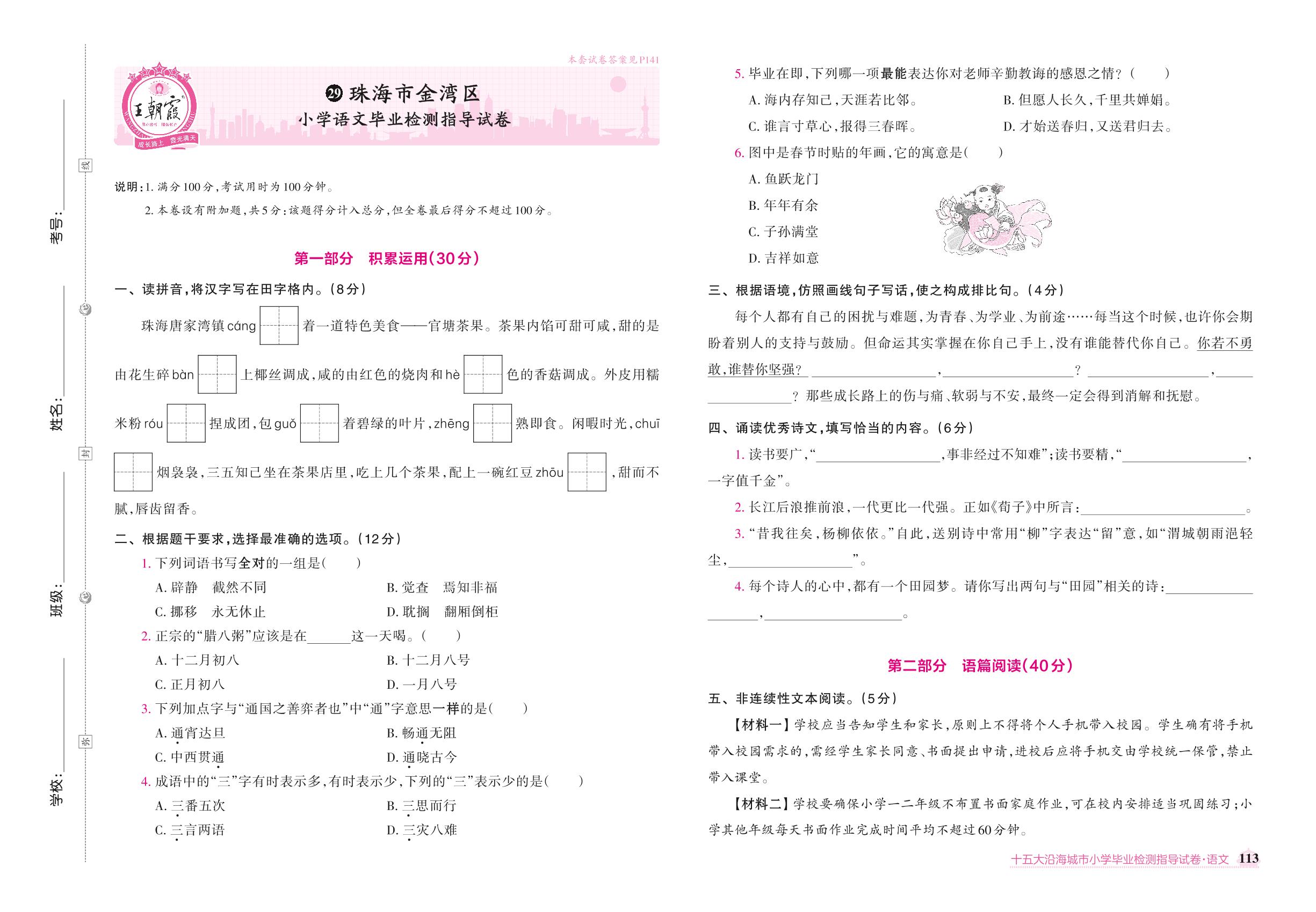 珠海市金湾区小学语文毕业检测指导试卷【29】