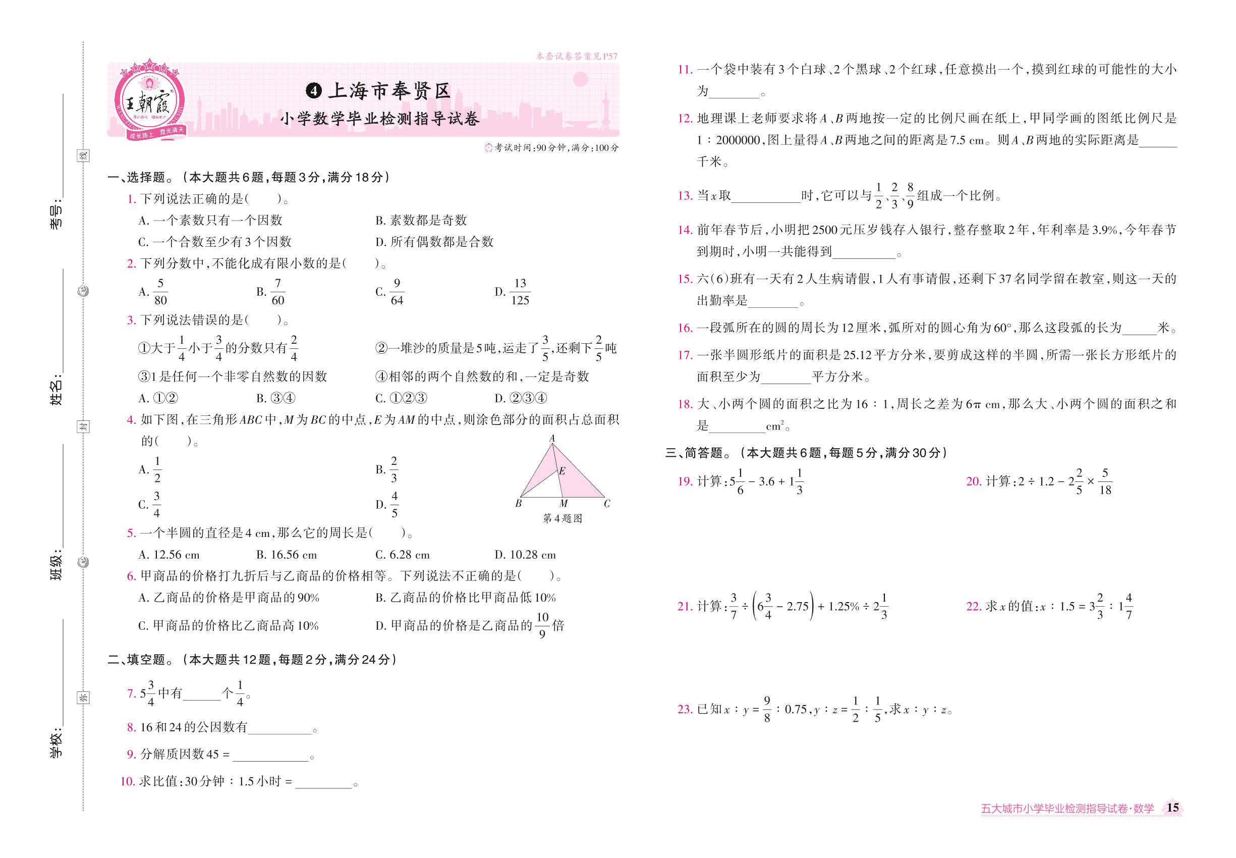 上海市奉贤区小学数学毕业检测指导试卷【4】