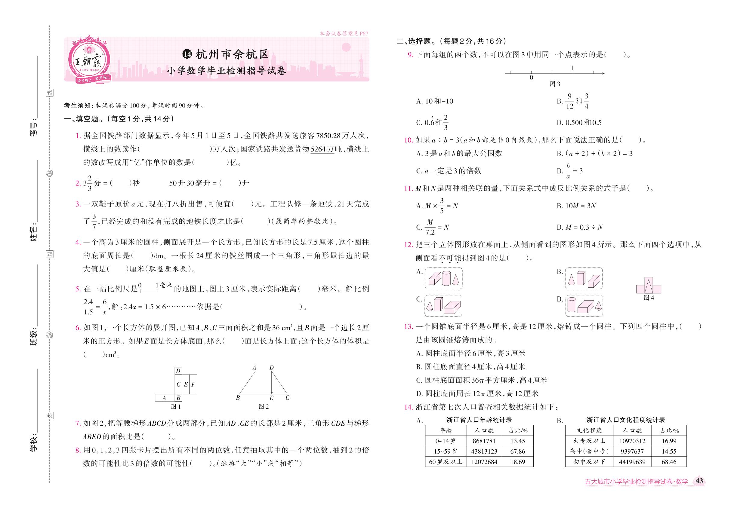 杭州市余杭区小学数学毕业检测指导试卷【14】