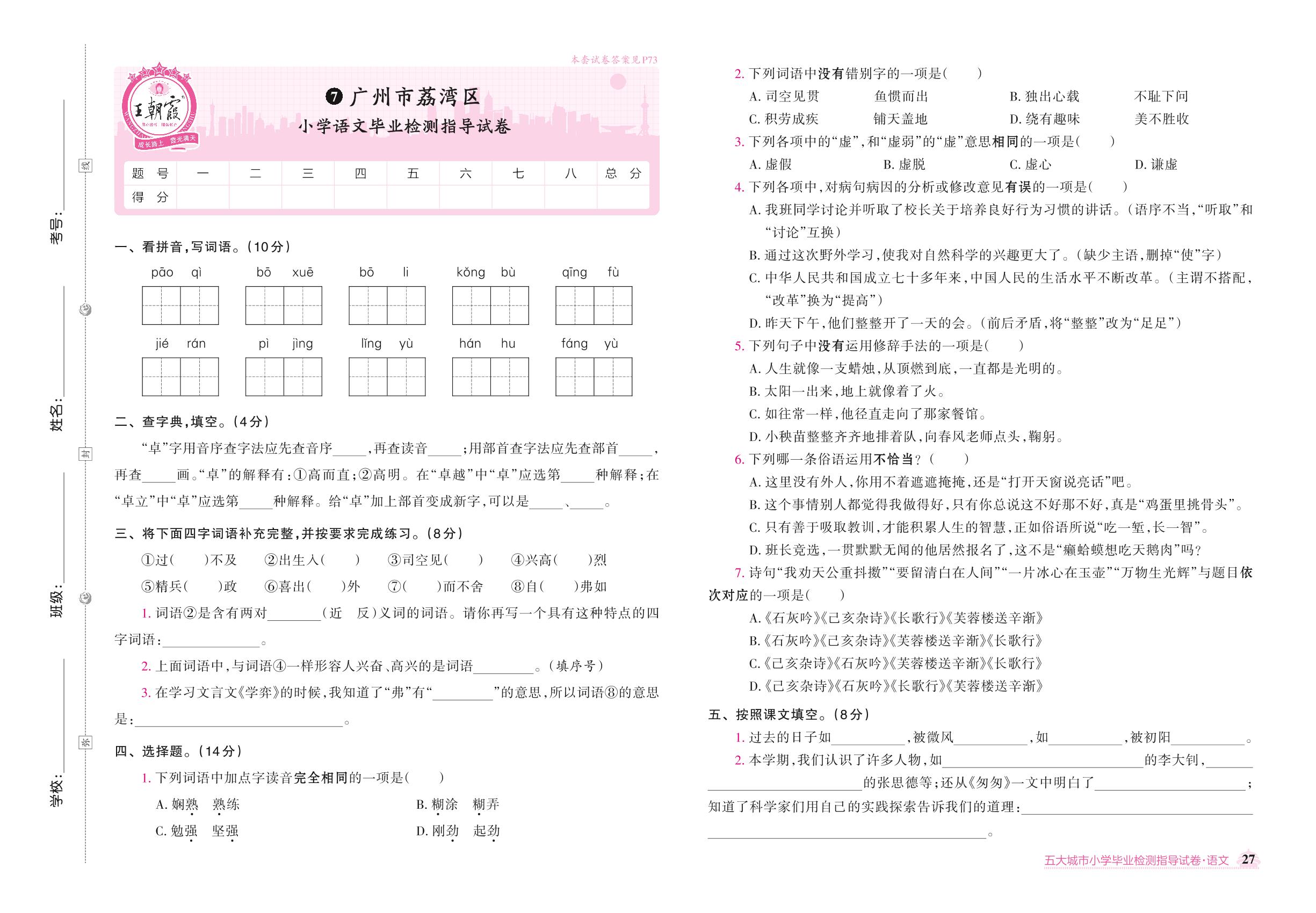 广州市荔湾区小学语文毕业检测指导试卷【7】