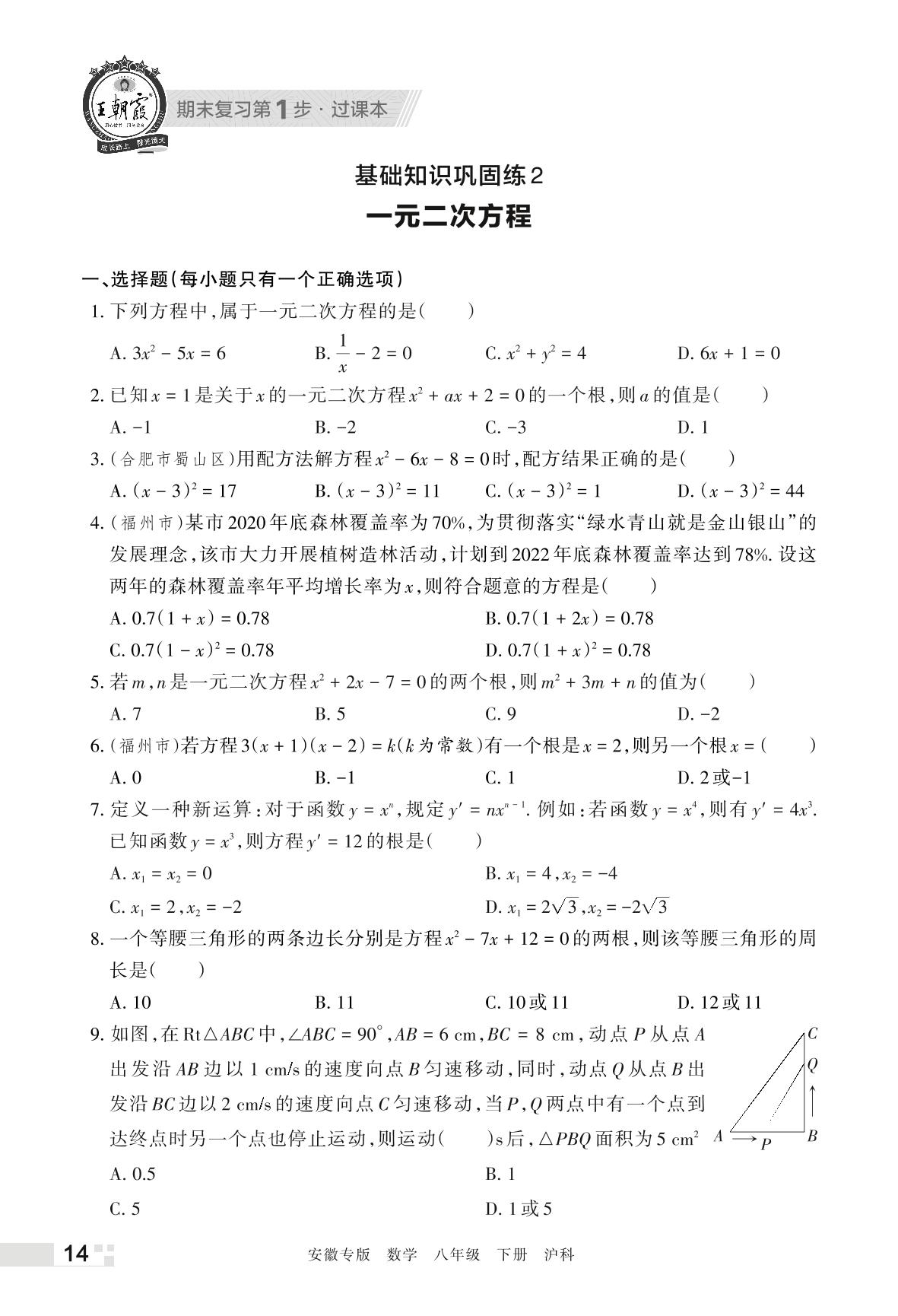 王朝霞期末过课本——基础知识巩固练2 一元二次方程八年级下册数学(沪科版)
