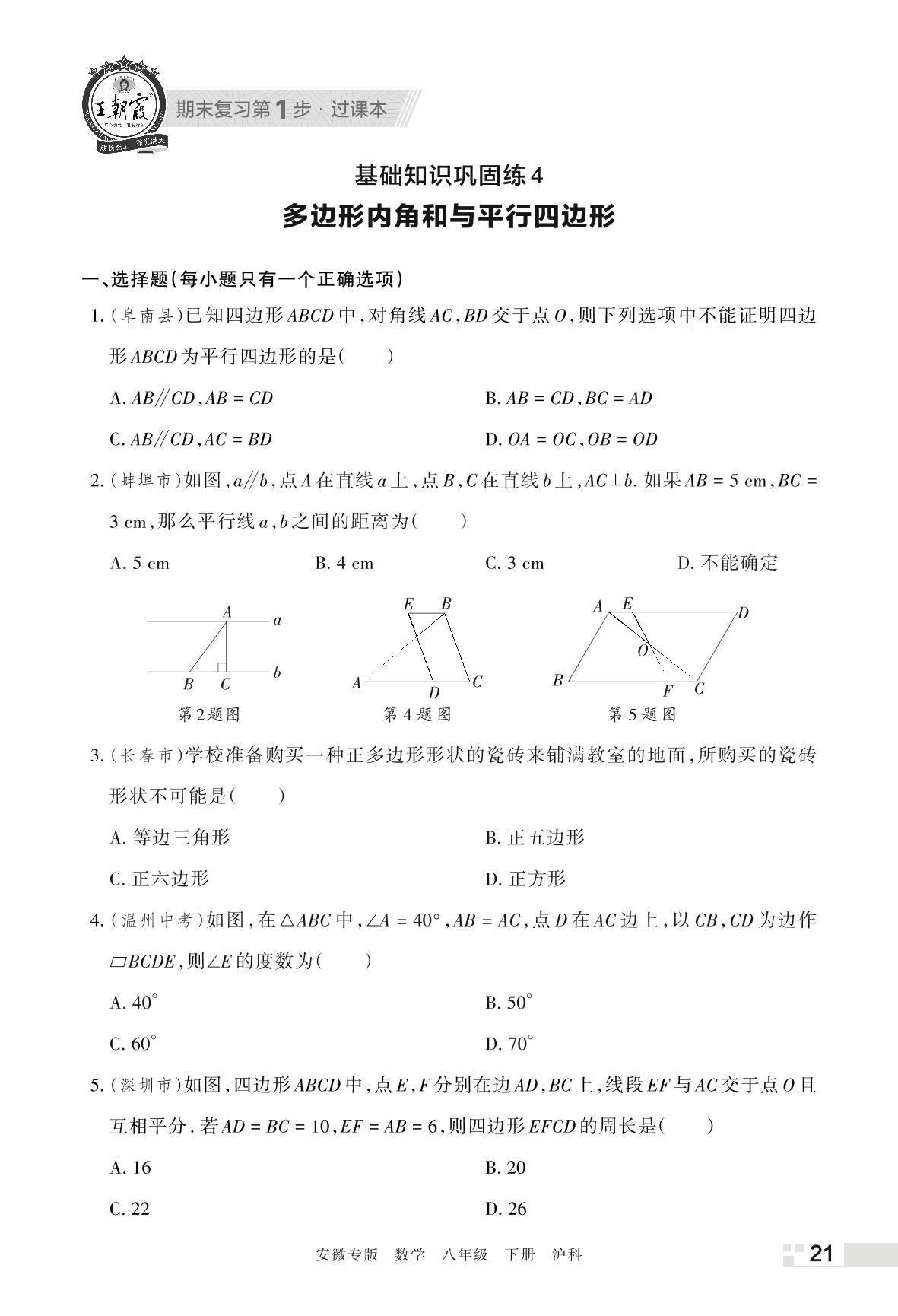 王朝霞期末过课本——基础知识巩固练4 多边形内角和与平行四边形八年级下册数学(沪科版)