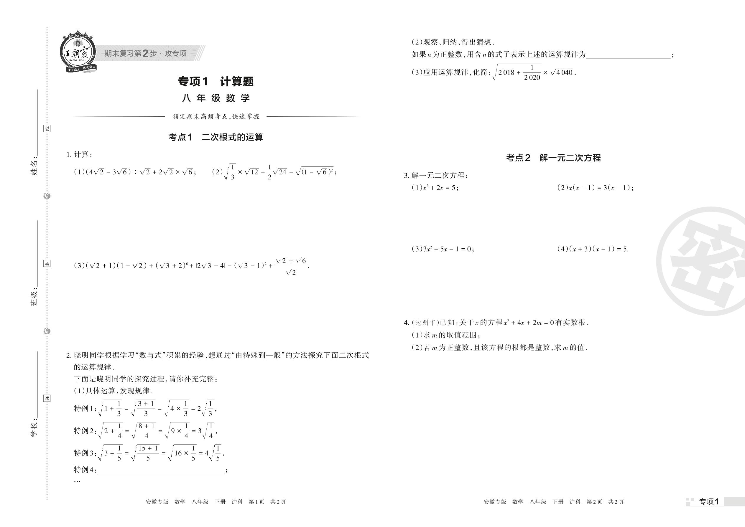 王朝霞期末专项卷——计算题八年级下册数学(沪科版)【1】