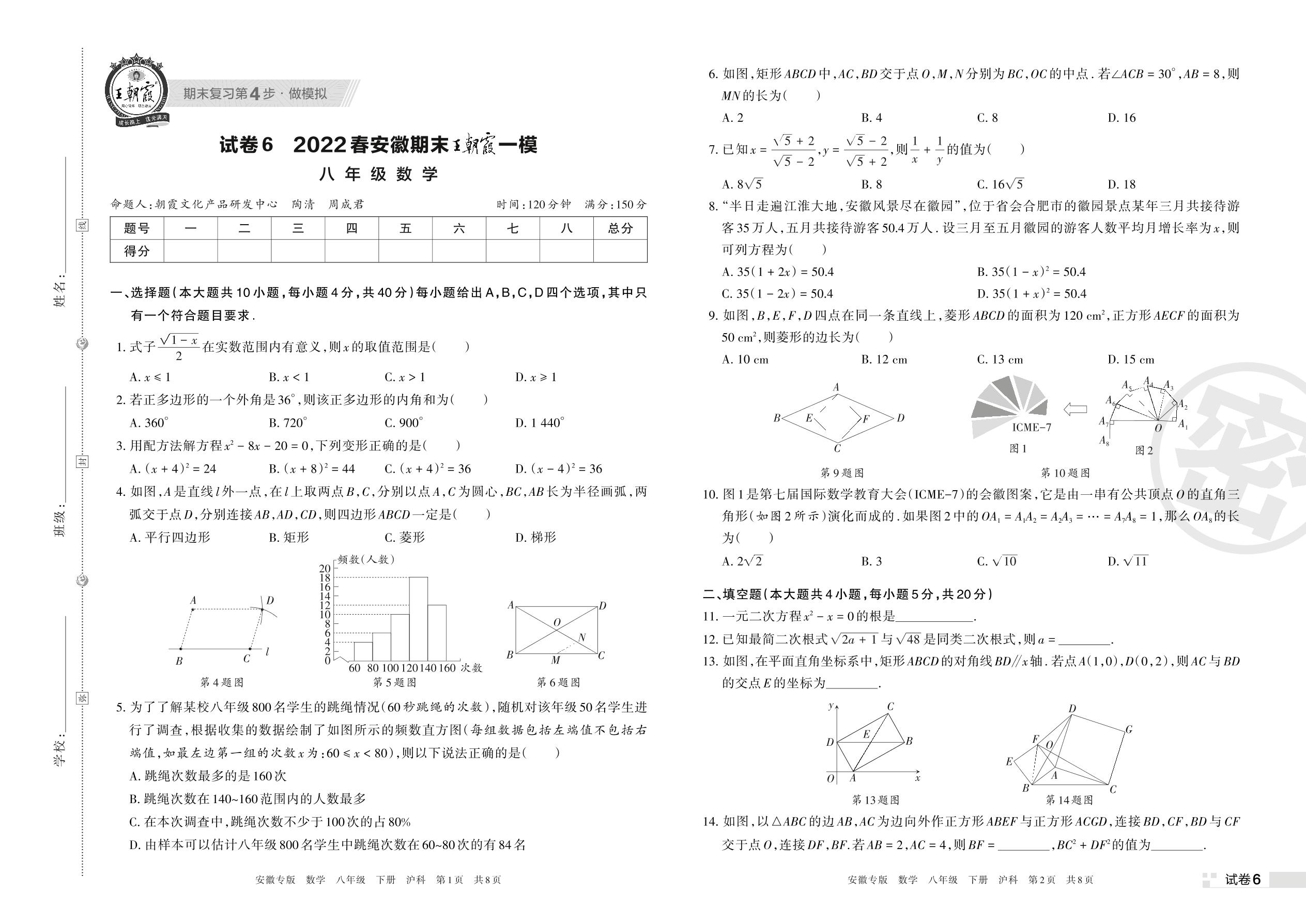 王朝霞期末模拟卷八年级下册数学(沪科版)【6】