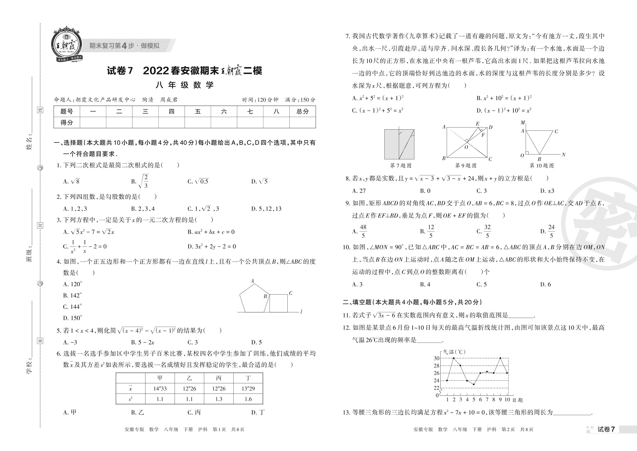 王朝霞期末模拟卷八年级下册数学(沪科版)【7】