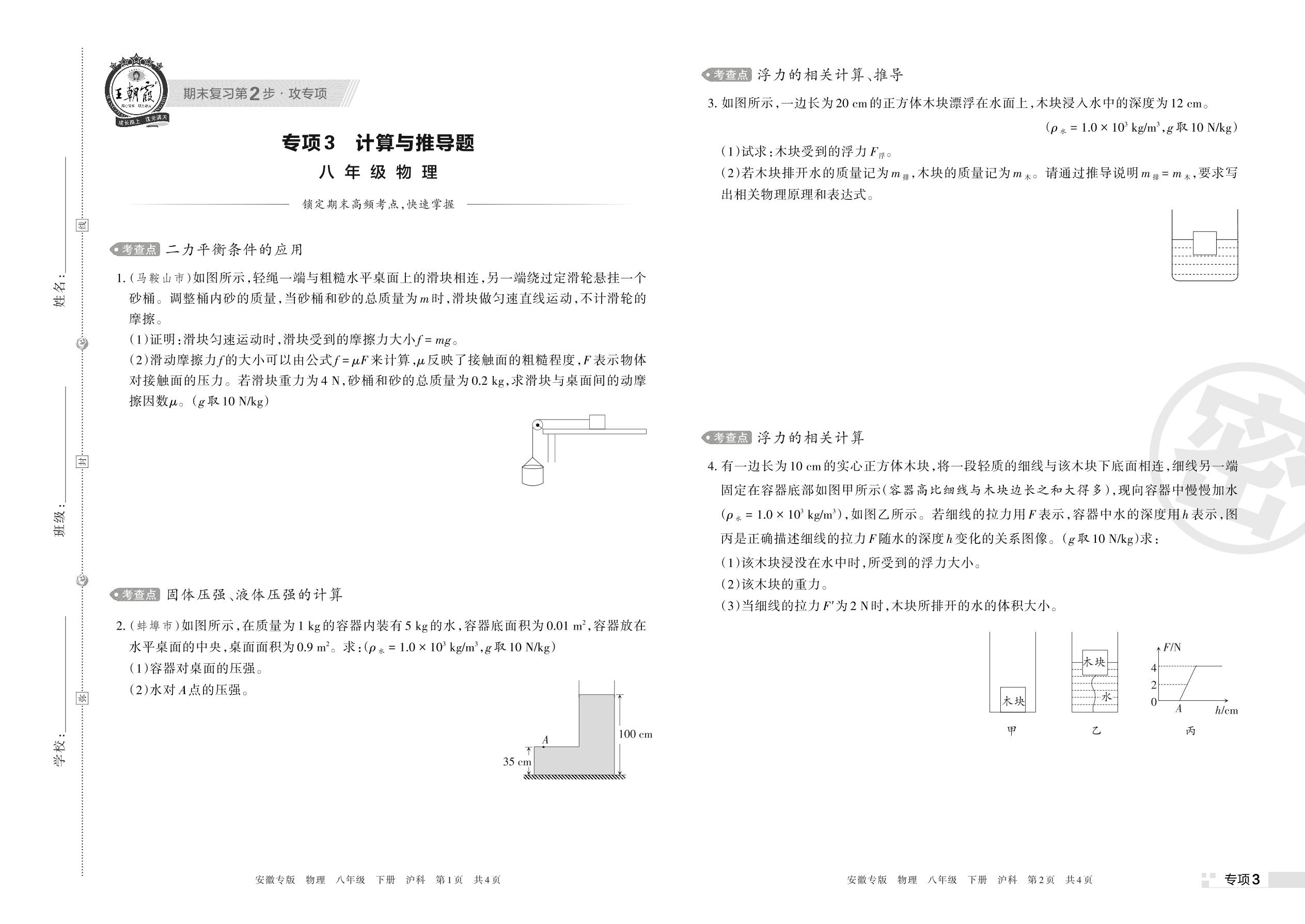 王朝霞期末专项卷——计算与推导题八年级下册物理(沪科版)【3】