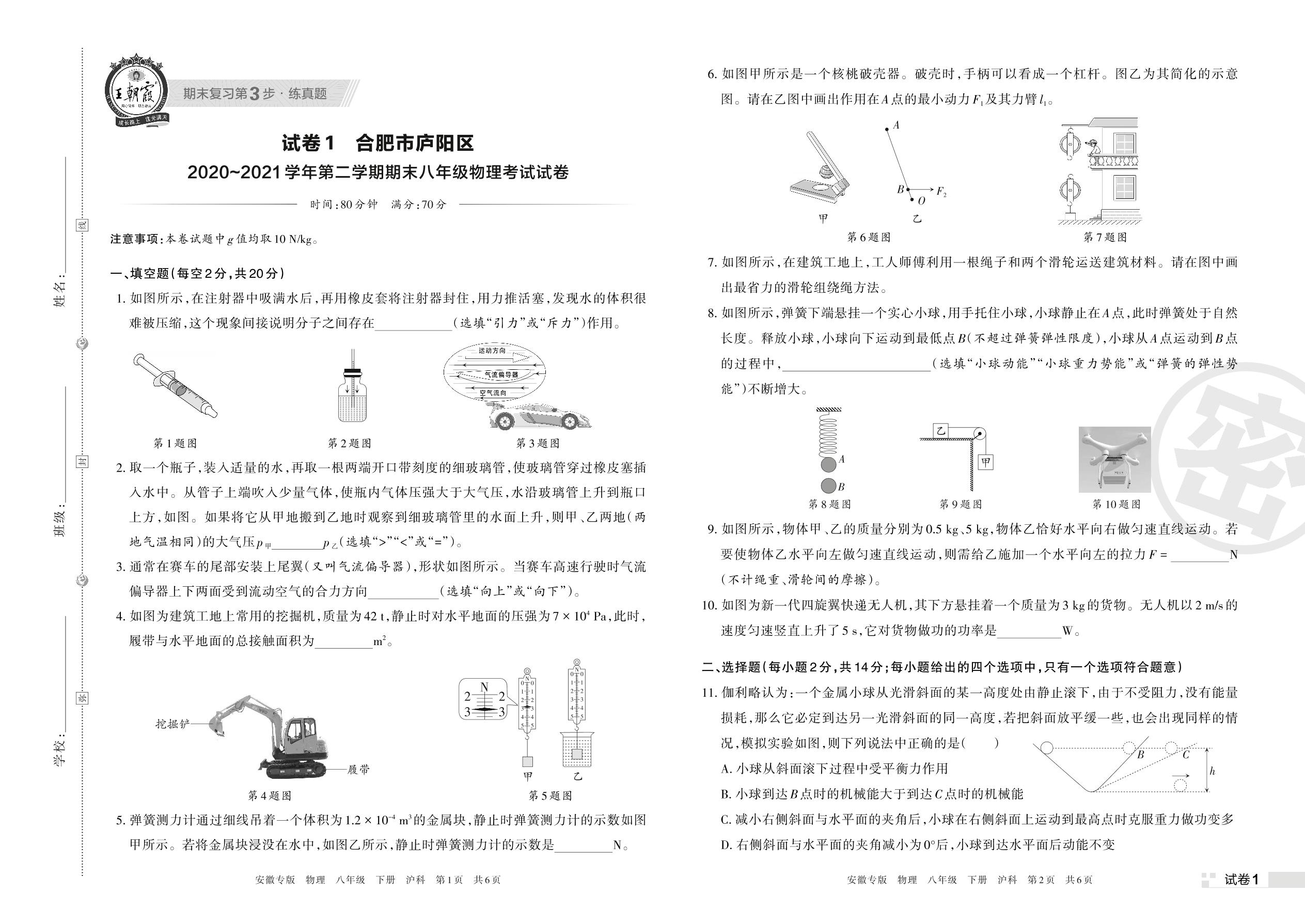 合肥市庐阳区2020~2021学年第二学期期末八年级物理考试试卷(沪科版)【1】