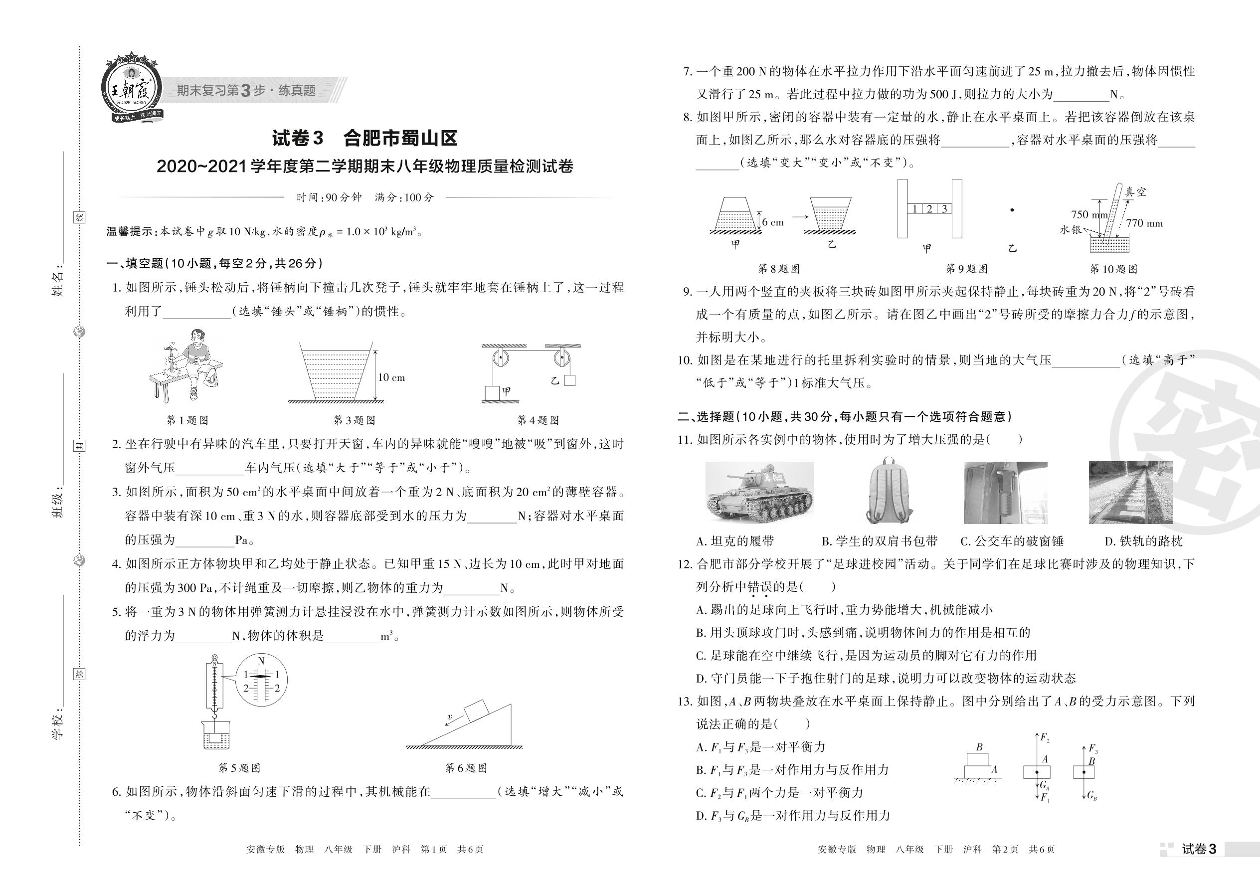 合肥市蜀山区2020~2021学年度第二学期期末八年级物理质量检测试卷(沪科版)【3】