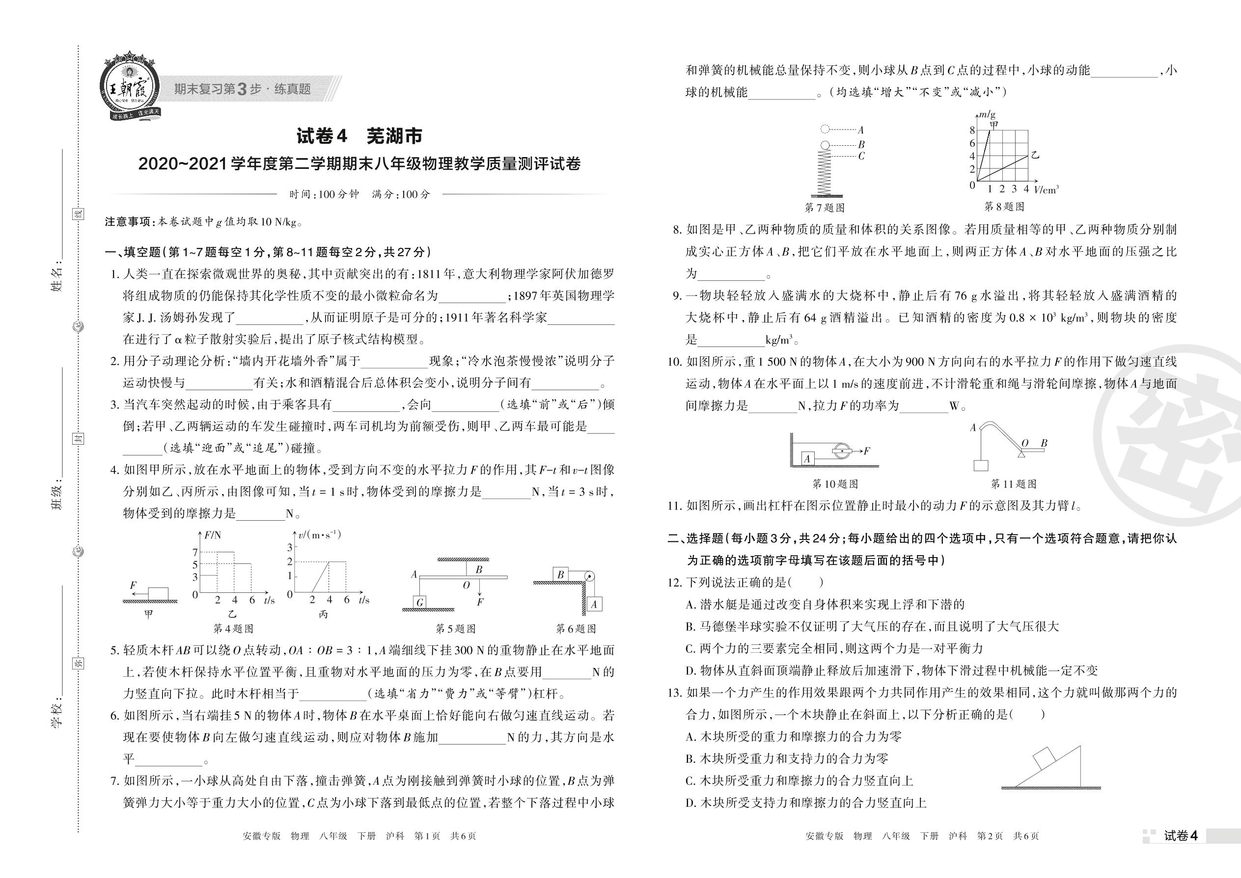 芜湖市2020~2021学年度第二学期期末八年级物理教学质量测评试卷(沪科版)【4】