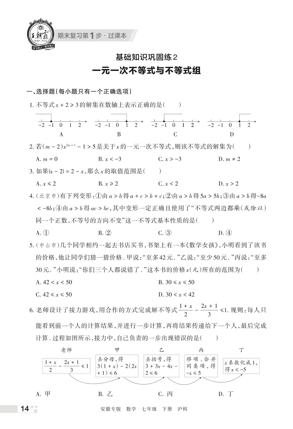 王朝霞期末过课本——基础知识巩固练2 一元一次不等式与不等式组七年级下册数学(沪科版)