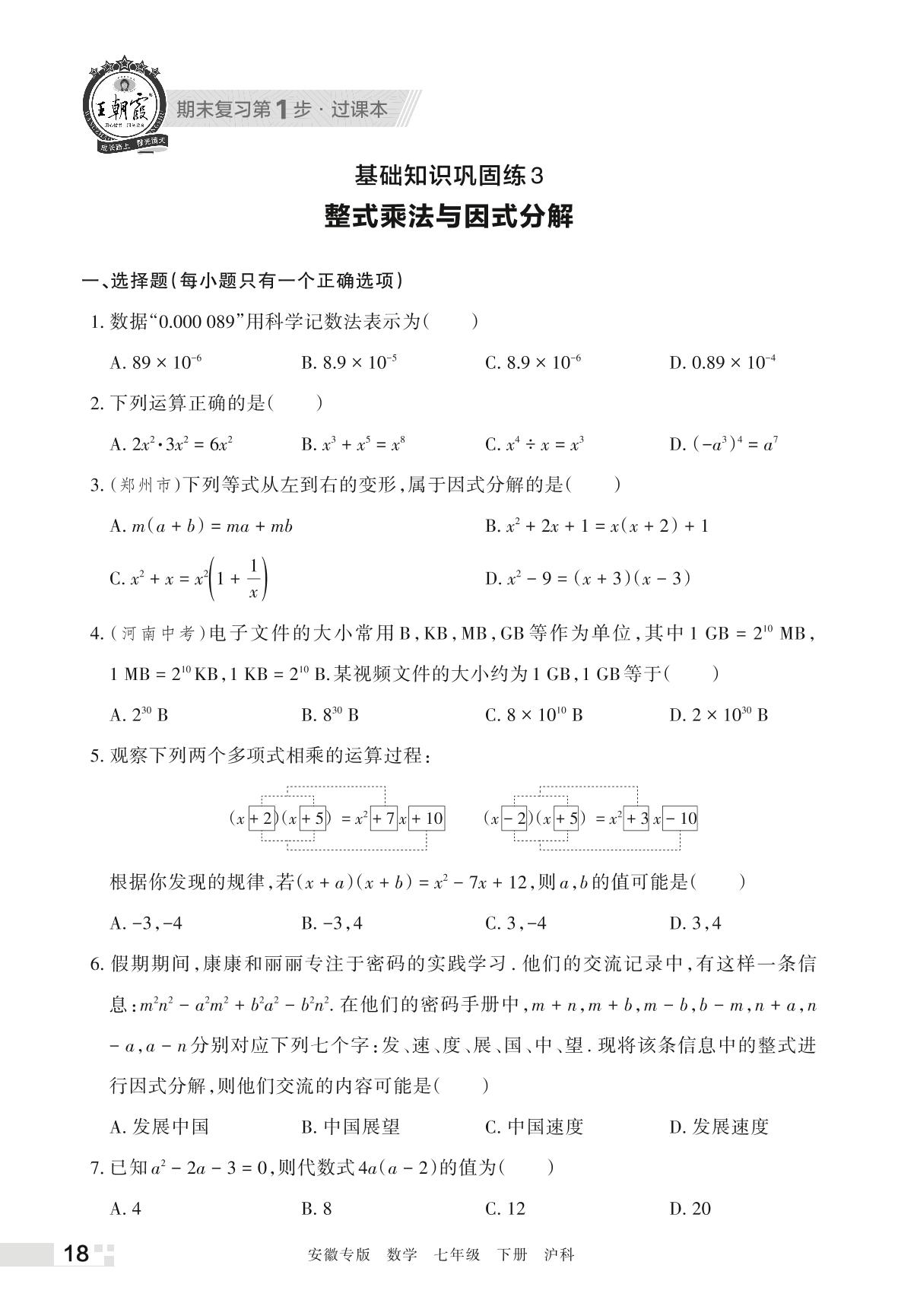 王朝霞期末过课本——基础知识巩固练3 整式乘法与因式分解七年级下册数学(沪科版)