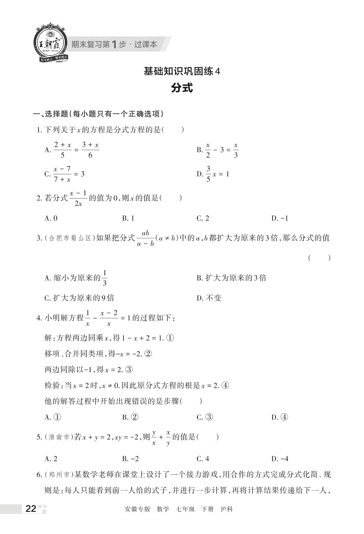 王朝霞期末过课本——基础知识巩固练4 分式七年级下册数学(沪科版)