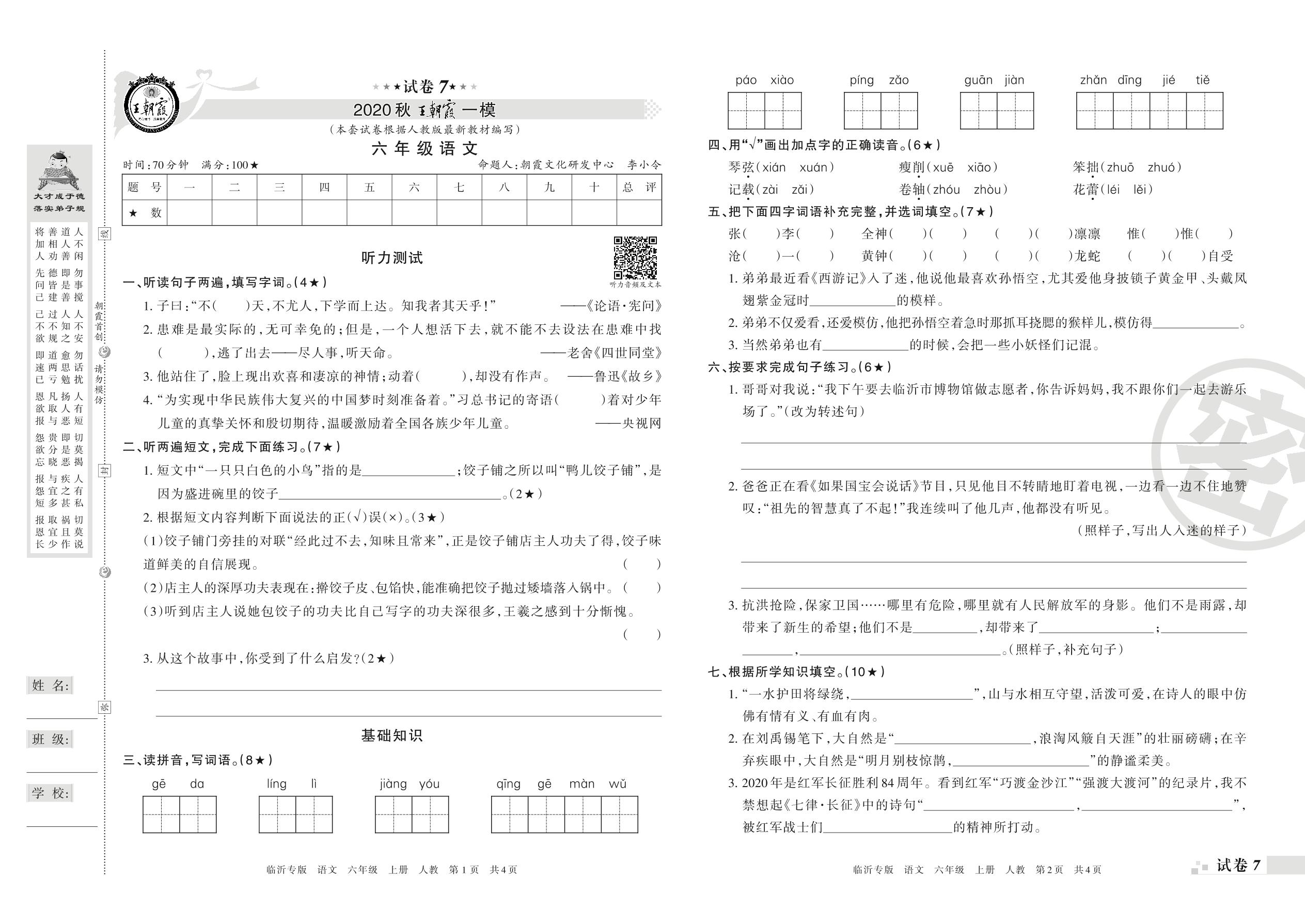王朝霞期末模拟卷六年级上册语文(人教版)_R21080210714【7】