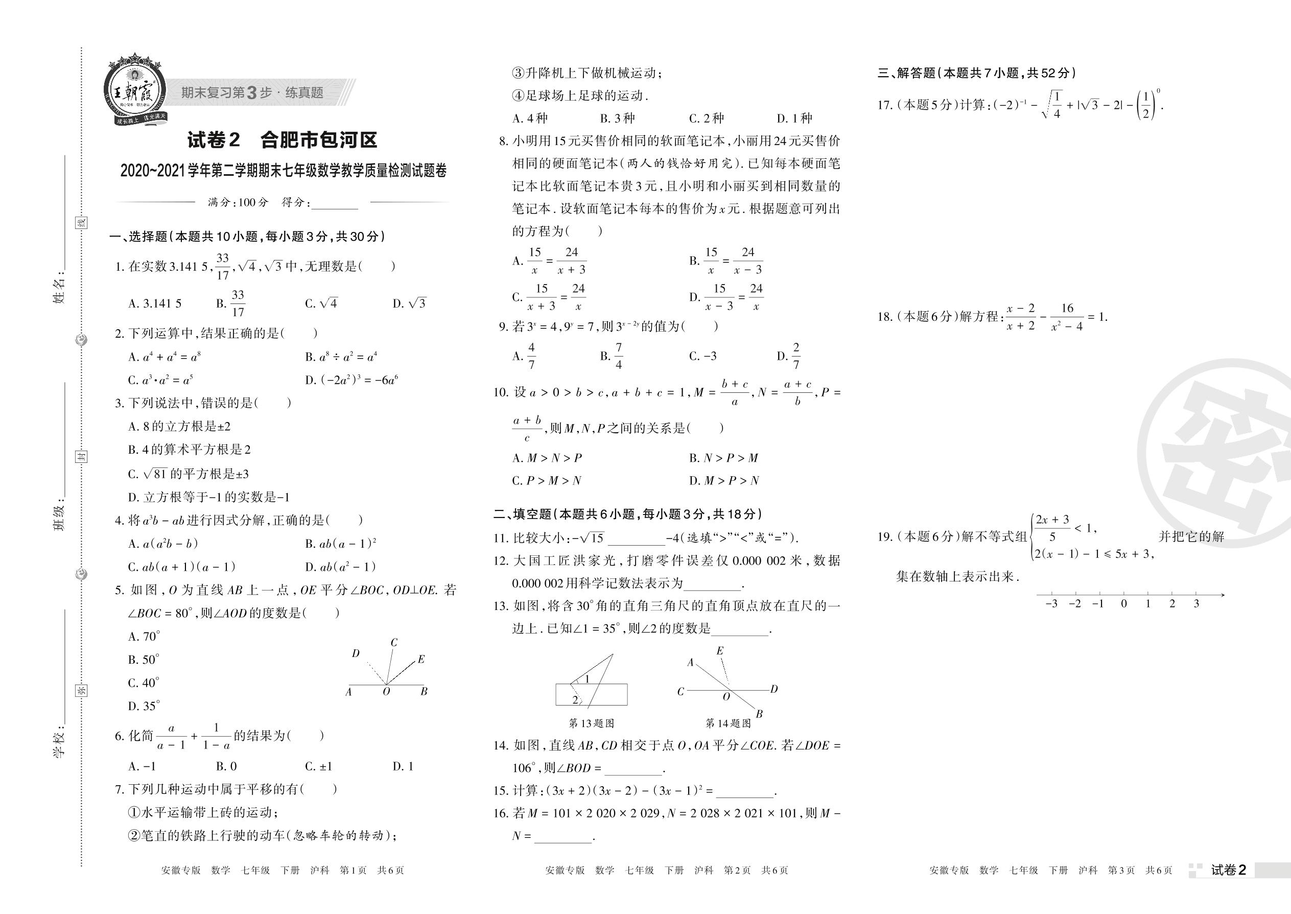合肥市包河区2020~2021学年第二学期期末七年级数学教学质量检测试题卷 (沪科版)【2】